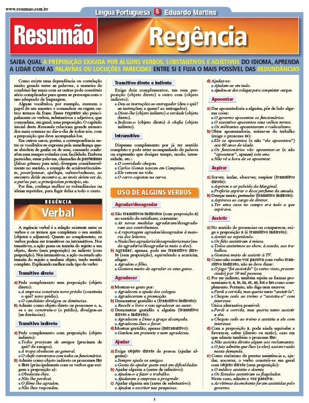 Regência verbal. Tipos de verbo – transitivo direto, transitivo indireto, transitivo direto e indireto e intransitivos. Uso de alguns verbos. Regência nominal. Relação de substantivos e adjetivos acompanhados da preposição ou das preposições mais usualmente empregadas com eles. Além de regência, este título também esclarece dúvidas sobre o uso de palavras ou de locuções parecidas e apresenta uma relação de redundâncias que devem ser evitadas a todo custo. Atualizado com as novas regras de ortografia.