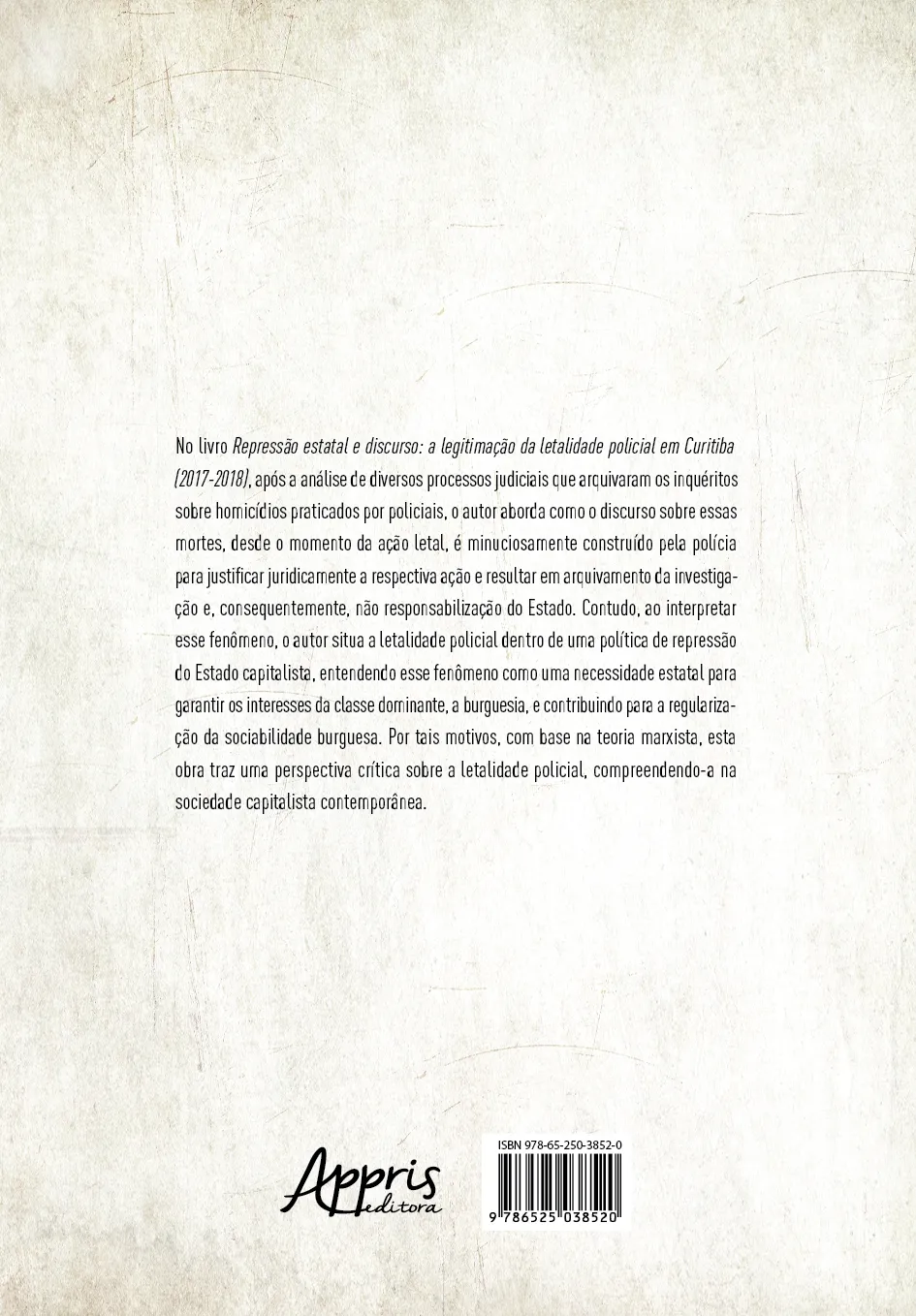 No livro Repressão estatal e discurso: a legitimação da letalidade policial em Curitiba (2017-2018), após a análise de diversos processos judiciais que arquivaram os inquéritos sobre homicídios praticados por policiais, o autor aborda como o discurso sobre essas mortes, desde o momento da ação letal, é minuciosamente construído pela polícia para justificar juridicamente a respectiva ação e resultar em arquivamento da investigação e, consequentemente, não responsabilização do Estado. Contudo, ao interpretar esse fenômeno, o autor situa a letalidade policial dentro de uma política de repressão do Estado capitalista, entendendo esse fenômeno como uma necessidade estatal para garantir os interesses da classe dominante, a burguesia, e contribuindo para a regularização da sociabilidade burguesa. Por tais motivos, com base na teoria marxista, esta obra traz uma perspectiva crítica sobre a letalidade policial, compreendendo-a na sociedade capitalista contemporânea.