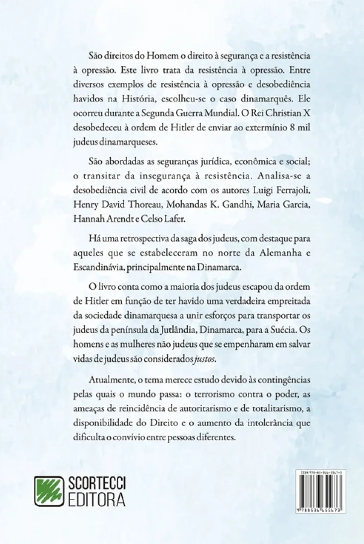 São direitos do Homem o direito à segurança e a resistência à opressão. Este livro trata da resistência à opressão. Entre diversos exemplos de resistência à opressão e desobediência havidos na História, escolheu-se o caso dinamarquês. Ele ocorreu durante a Segunda Guerra Mundial. O Rei Christian X desobedeceu à ordem de Hitler de enviar ao extermínio 8 mil judeus dinamarqueses. São abordadas as seguranças jurídica, econômica e social; o transitar da insegurança à resistência. Analisa-se a desobediência civil de acordo com os autores Luigi Ferrajoli, Henry David Thoreau, Mohandas K. Gandhi, Maria Garcia, Hannah Arendt e Celso Lafer. Há uma retrospectiva da saga dos judeus, com destaque para aqueles que se estabeleceram no norte da Alemanha e Escandinávia, principalmente na Dinamarca. O livro conta como a maioria dos judeus escapou da ordem de Hitler em função de ter havido uma verdadeira empreitada da sociedade dinamarquesa a unir esforços para transportar os judeus da península da Jutlândia, Dinamarca, para a Suécia. Os homens e as mulheres não judeus que se empenharam em salvar vidas de judeus são considerados justos.
