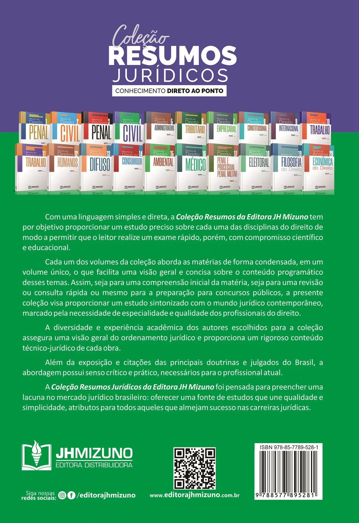 Com uma linguagem simples e direta, a Coleção Resumos da JH Mizuno tem por objetivo proporcionar um estudo preciso sobre cada uma das disciplinas do direito de modo a permitir que o leitor realize um exame rápido, porém, com compromisso científico e educacional. Cada um dos volumes da coleção aborda as matérias de forma condensada, em um volume único, o que facilita uma visão geral e concisa sobre o conteúdo programático desses temas. Assim, seja para uma compreensão inicial da matéria, seja para uma revisão ou consulta rápida ou mesmo para a preparação para concursos públicos, a presente coleção visa proporcionar um estudo sintonizado com o mundo jurídico contemporâneo, marcado pela necessidade de especialidade e qualidade dos profissionais do direito. A diversidade e experiência acadêmica dos autores escolhidos para a coleção assegura uma visão geral do ordenamento jurídico e proporciona um rigoroso conteúdo técnico-jurídico de cada obra. Além da exposição e citações das principais doutrinas e julgados do Brasil, a abordagem possui senso crítico e prático, necessários para o profissional atual. A coleção Resumos Jurídicos da JH Mizuno foi pensada para preencher uma lacuna no mercado jurídico brasileiro: oferecer uma fonte de estudos que une qualidade e simplicidade, atributos para todos aqueles que almejam sucesso nas carreiras jurídicas.