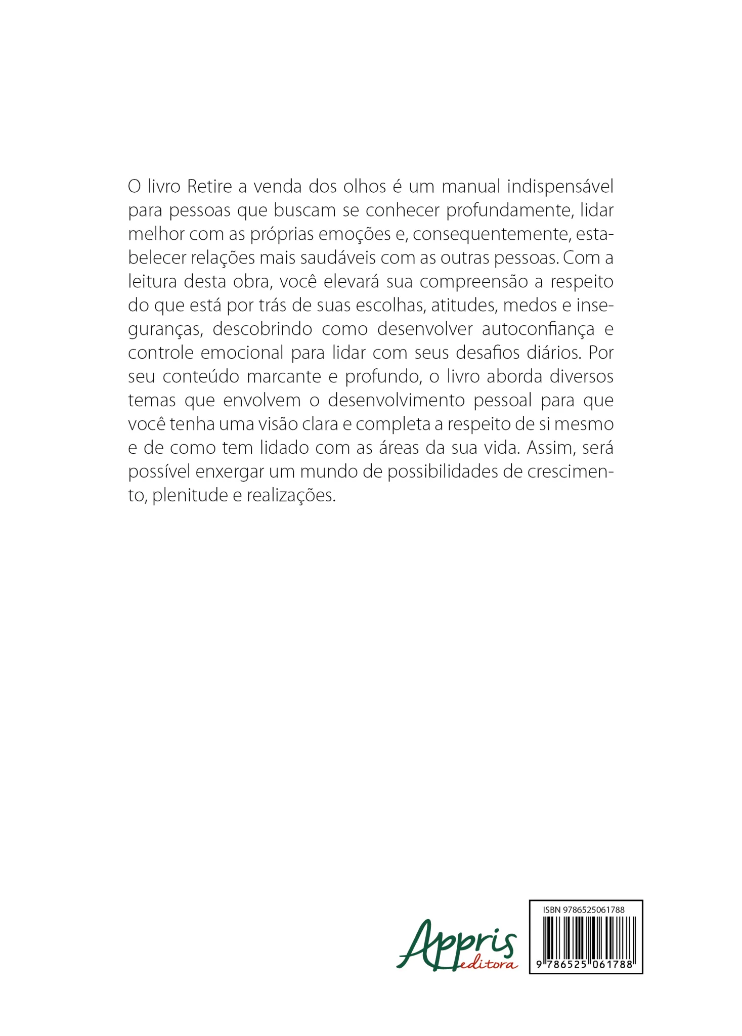 O livro Retire a venda dos olhos é um manual indispensável para pessoas que buscam se conhecer profundamente, lidar melhor com as próprias emoções e consequentemente, estabelecer relações mais saudáveis com as outras pessoas. Com a leitura desta obra, você elevará sua compreensão a respeito do que está por trás de suas escolhas, atitudes, medos e inseguranças, descobrindo como desenvolver autoconfiança e controle emocional para lidar com seus desafios diários. Por seu conteúdo marcante e profundo, o livro aborda diversos temas que envolvem o desenvolvimento pessoal para que você tenha uma visão clara e completa a respeito de si mesmo e de como tem lidado com as áreas da sua vida. Assim, será possível enxergar um mundo de possibilidades de crescimento, plenitude e realizações.