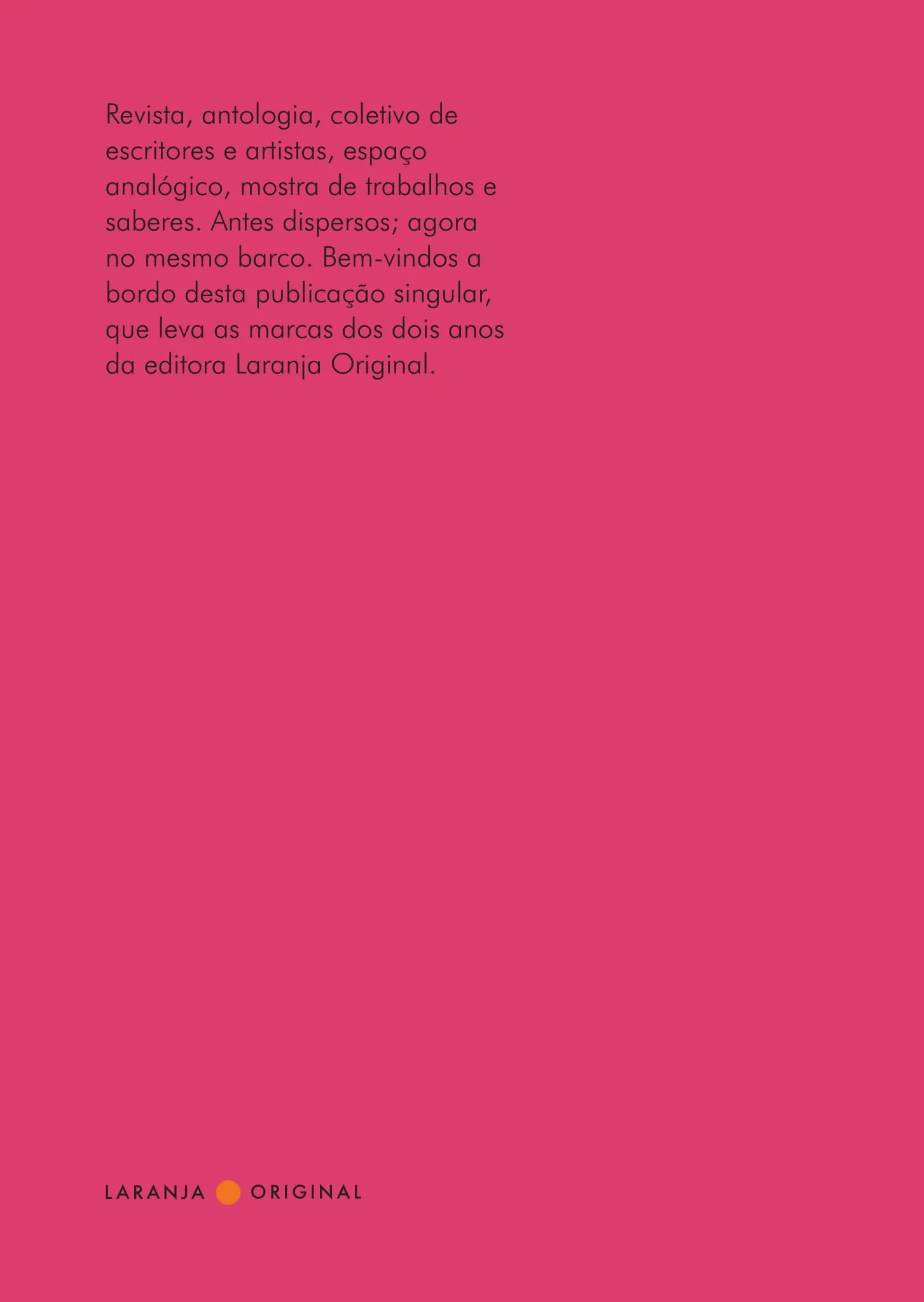 A criação da Revista de Literatura e Arte Laranja Original veio da ideia de reunir trabalhos inéditos de artistas e colaboradores da editora na forma de livro impresso, integrando assim suas diferentes expressões – poesia, prosa ficcional, crítica literária, artigos de opinião, ilustração, fotografia e artes gráficas. Com periodicidade de seis a nove meses, o primeiro número está sendo lançado no outono de 2018.