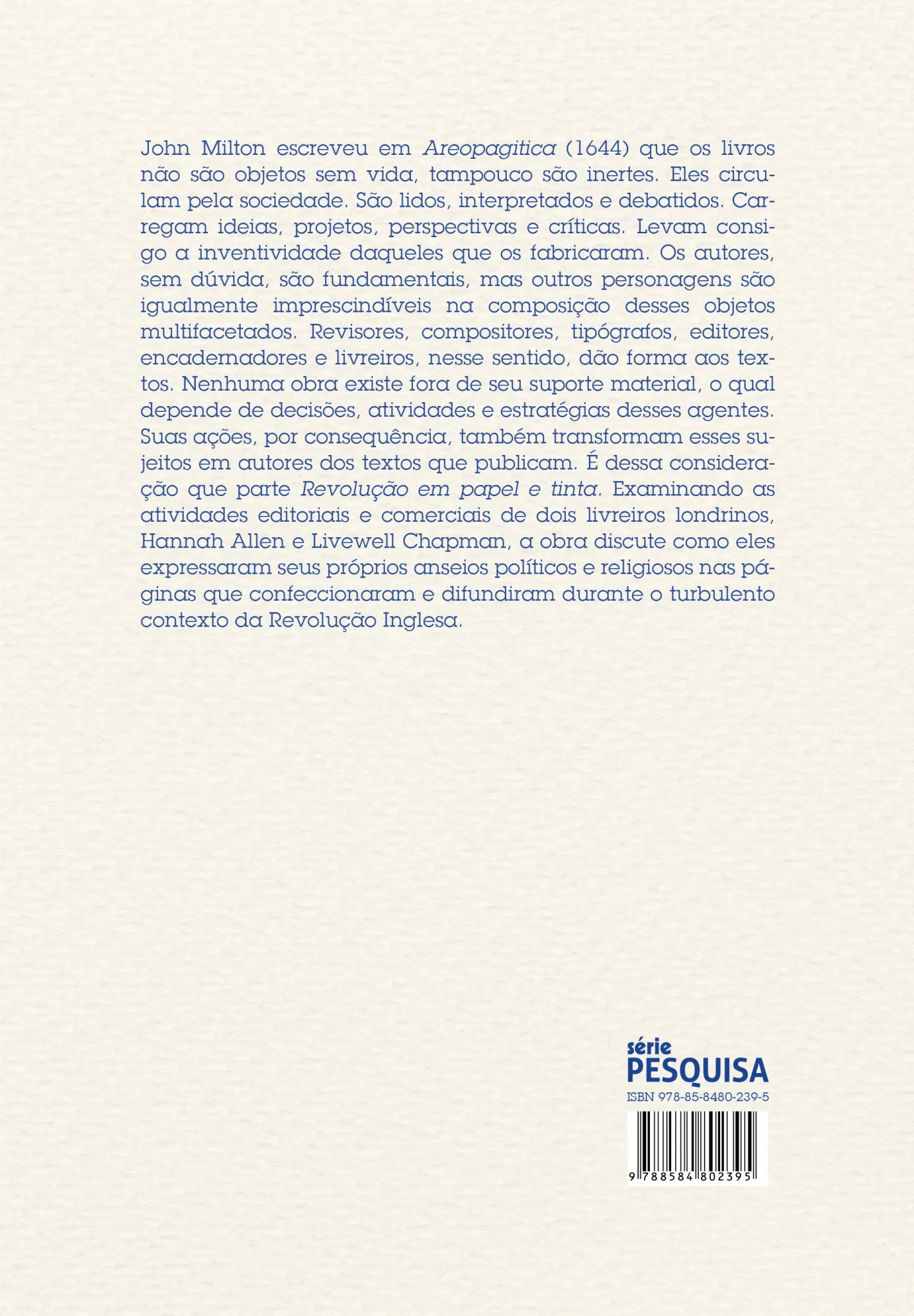 John Milton escreveu em Areopagitica (1644) que os livros não são objetos sem vida, tampouco são inertes. Eles circulam pela sociedade. São lidos, interpretados e debatidos. Carregam ideias, projetos, perspectivas e críticas. Levam consigo a inventividade daqueles que os fabricaram. Os autores, sem dúvida, são fundamentais, mas outros personagens são igualmente imprescindíveis na composição desses objetos multifacetados. Revisores, compositores, tipógrafos, editores, encadernadores e livreiros, nesse sentido, dão forma aos textos. Nenhuma obra existe fora de seu suporte material, o qual depende de decisões, atividades e estratégias desses agentes. Suas ações, por consequência, também transformam esses sujeitos em autores dos textos que publicam. É dessa consideração que parte Revolução em papel e tinta. Examinando as atividades editoriais e comerciais de dois livreiros londrinos, Hannah Allen e Livewell Chapman, a obra discute como eles expressaram seus próprios anseios políticos e religiosos nas páginas que confeccionaram e difundiram durante o turbulento contexto da Revolução Inglesa.