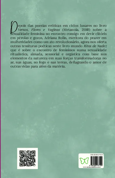 Depois das poesias eróticas em ciclos lunares no livro “Versos, Flores e Vaginas” (Metanoia, 2018) sobre a sexualidade feminina no encontro consigo em devir clitóris em pérolas e gozos, Adriana Rolin, escritora do prazer em mulheridades como um ato revolucionário, agora nos oferta outras tessituras poéticas neste livro-mundo “Ritos de Nudez” que é sobre o encontro de femininos numa sexualidade ritualística, almada, sensorial e orgástica com base nos elementos da natureza em suas forças transformadoras no ar, nas águas, no fogo e nas terras, deflagrando o amor de outras vidas para além da matéria