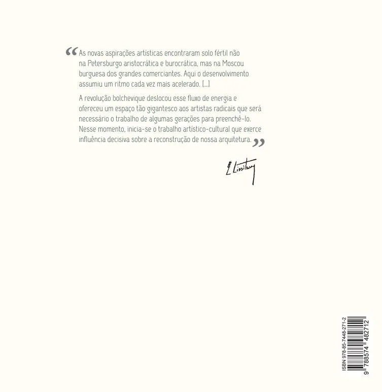 “Rússia: a reconstrução da arquitetura na União Soviética” se divide em três partes. A primeira é um tratado teórico publicado originalmente em Viena no ano de 1930. Temos ali os fundamentos do pensamento arquitetônico de EL LISSITZKY para a reconstrução da União Soviética, evidenciando o papel da arquitetura e do urbanismo para a consolidação da revolução e fornecendo algumas das diretrizes do que se tornaria a arquitetura moderna.