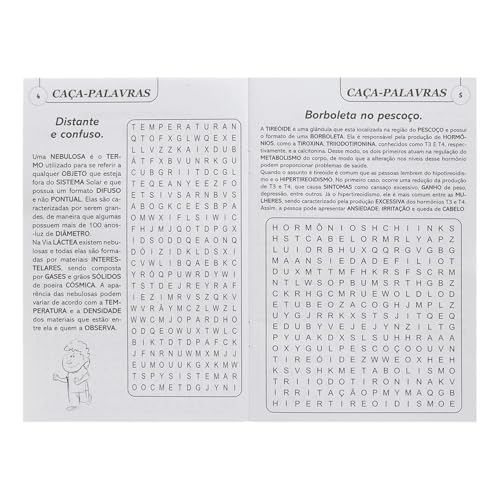 Os caça-palavras contém assuntos diversos relacionados a cultura, tecnologia, ciência, arte… A questões exercitam nosso cérebro trazendo questões da atualidade e do passado, fazendo nosso córtex trabalhar toda a área da memória. Essa dinâmica de construção traz benefícios de longo prazo, fazendo nosso cérebro rejuvenescer.