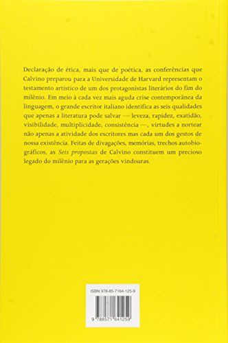 Declaração de ética, mais que de poética, as conferências que Calvino preparou para a Universidade Harvard representam o testamento artístico de um dos protagonistas literários do fim de milênio. Em meio à crise contemporânea da linguagem, cada vez mais aguda, o grande escritor italiano identifica as seis qualidades que apenas a literatura pode salvar – leveza, rapidez, exatidão, visibilidade, multiplicidade, consistência -, virtudes a nortear não apenas a atividade dos escritores mas cada um dos gestos de nossa existência. Feitas de divagações, memórias, trechos autobiográficos, as Seis propostas de Calvino constituem um precioso legado do milênio para as gerações do ano 2000.Prêmio Jabuti 1993 de Melhor Produção Editorial de Obra em Coleção