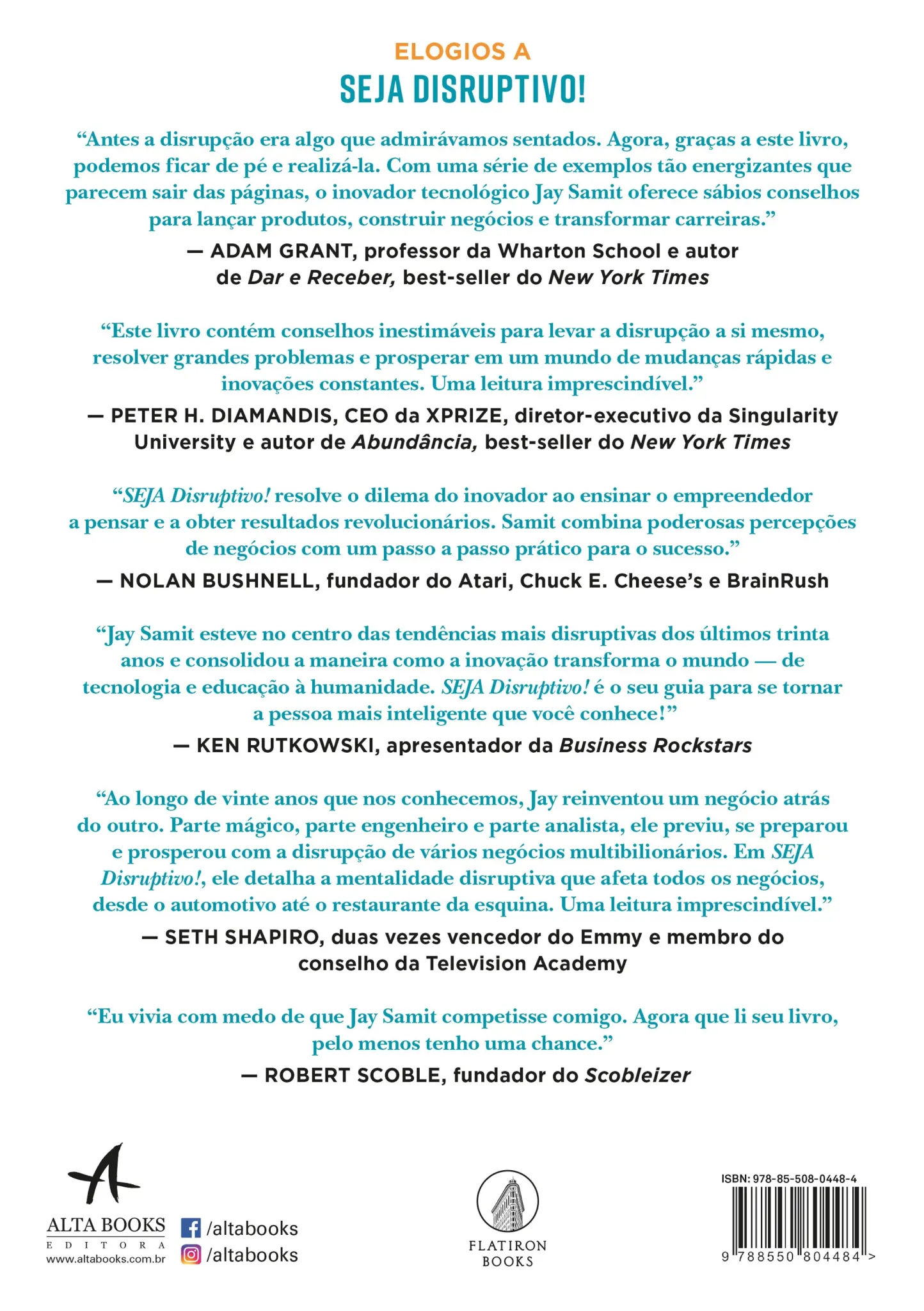 Em “Seja Disruptivo!”, Jay Samit, um expert em mídia-digital que lançou, desenvolveu e vendeu tanto startups como empresas da Fortune 500, descreve o método único que usou para inventar novos mercados e expandir negócios já estabelecidos. Ao incorporar histórias de suas experiências e anedotas de outros negócios inovadores e disruptivos – incluindo Richard Branson, Steve Jobs, Elon Musk, YouTube, Cirque du Soleil, Odor Eaters, Iams, Silly Putty e muitos outros -, Samit mostra como estratégias específicas que ajudam as empresas a florescer podem ser aplicadas em um nível individual. “Seja Disruptivo!” traz conselhos poderosos para quem quer inovar, para quem tem grandes ideias ma não sabe como executá-las, e para quem tem medo de passar a ser irrelevante em uma era de transformação tecnológica. Este livro envolve e muda opiniões ao desmistificar os mecanismos tanto da disrupção individual como da profissional.