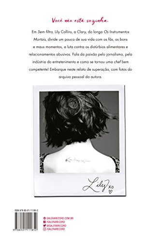 Lily Collins estreia na literatura com um tocante relato sobre autoimagem, confiança, amor-próprio, relacionamentos, família, amor e muito mais Lily Collins — estrela de filmes como Instrumentos mortais, Espelho, espelho meu e Simplesmente acontece — estreia na literatura com um livro confissão; uma conversa entre amigas. Honesta. Sem filtro. Pela primeira vez, Lily fala da vida pessoal e confessa seus segredos mais bem guardados. Lily desnuda suas vulnerabilidades com uma coragem comovente, e lembra que a vida não é feita apenas de risos e um eterno alvorecer cor-de-rosa. Para cada alegria há, também, dor e desilusão; luz e trevas, como em qualquer trama bem urdida. Aceitação é a palavra mágica. Para Lily, olhar o espelho e gostar do que vê, fazer as pazes com você mesma é a chave para suportar os dias ruins. Embora o caminho para o amor-próprio possa ser sinuoso, a autora aprendeu que basta uma pessoa estender a mão, alguém tomar uma pequena atitude para todos os demais entenderem que não estão sozinhos. Engraçada e terna, a voz de Lily irá inspirar você a ser quem é e a sempre dizer o que sente. Chegou a hora de achar sua voz. E viver sua vida… plenamente.