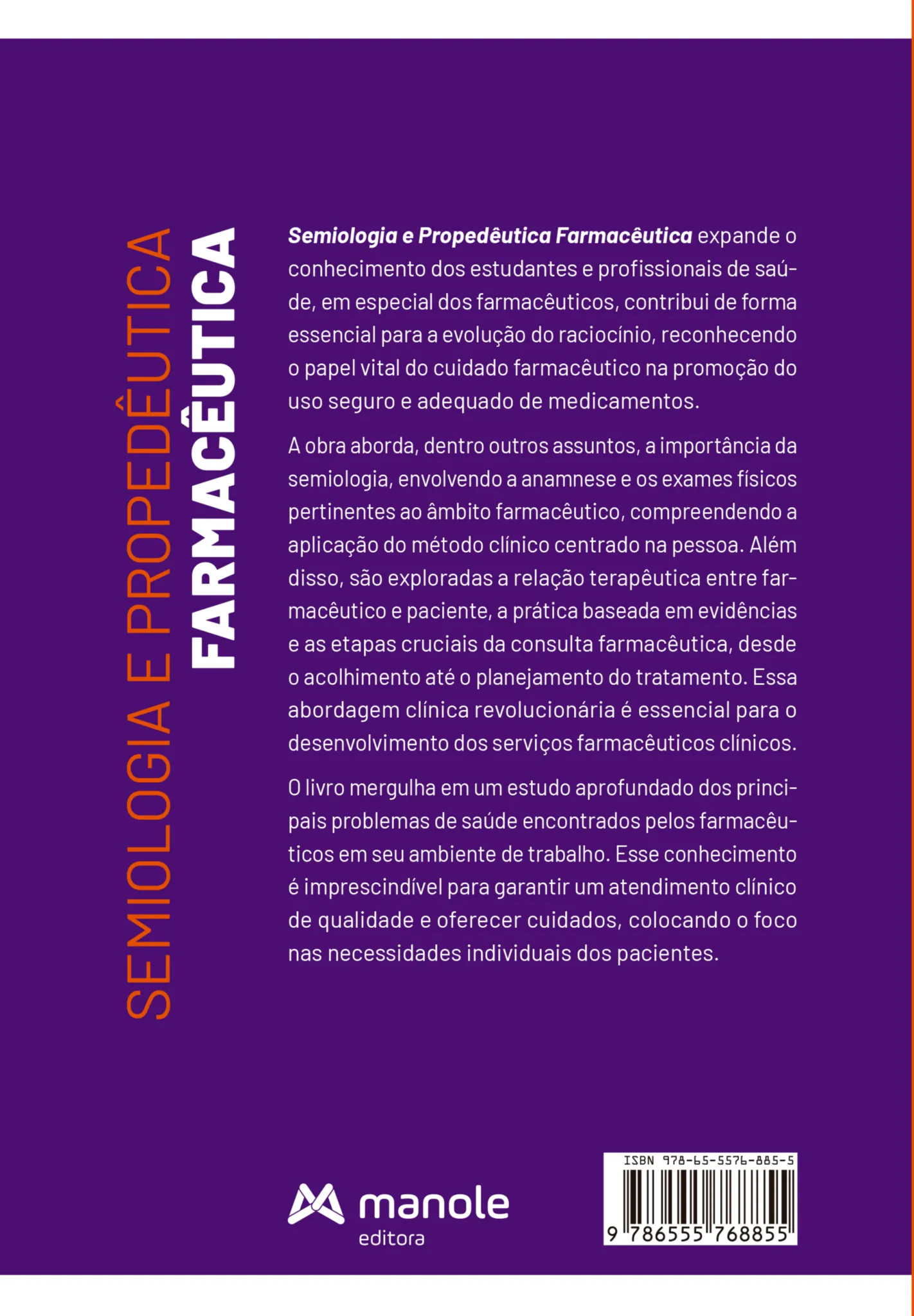 Com uma linguagem acessível e embasamento científico, cada capítulo de Semiologia e Propedêutica Farmacêutica explora temas fundamentais, como anamnese, exame físico, relação terapêutica farmacêutico-paciente e prática baseada em evidências. Dividido em três partes, o livro abrange desde o acolhimento do paciente até a prescrição farmacêutica, incluindo a abordagem detalhada de problemas de saúde comuns. Cada capítulo oferece diretrizes claras e exemplos clínicos para ajudar os profissionais de saúde a realizar uma avaliação abrangente e desenvolver um plano de cuidado eficaz. “Semiologia e Propedêutica FarmacêuticaO livro é um recurso indispensável para estudantes e profissionais de saúde, principalmente da área farmacêutica, que desejam aprimorar suas habilidades clínicas e fornecer um cuidado de qualidade.