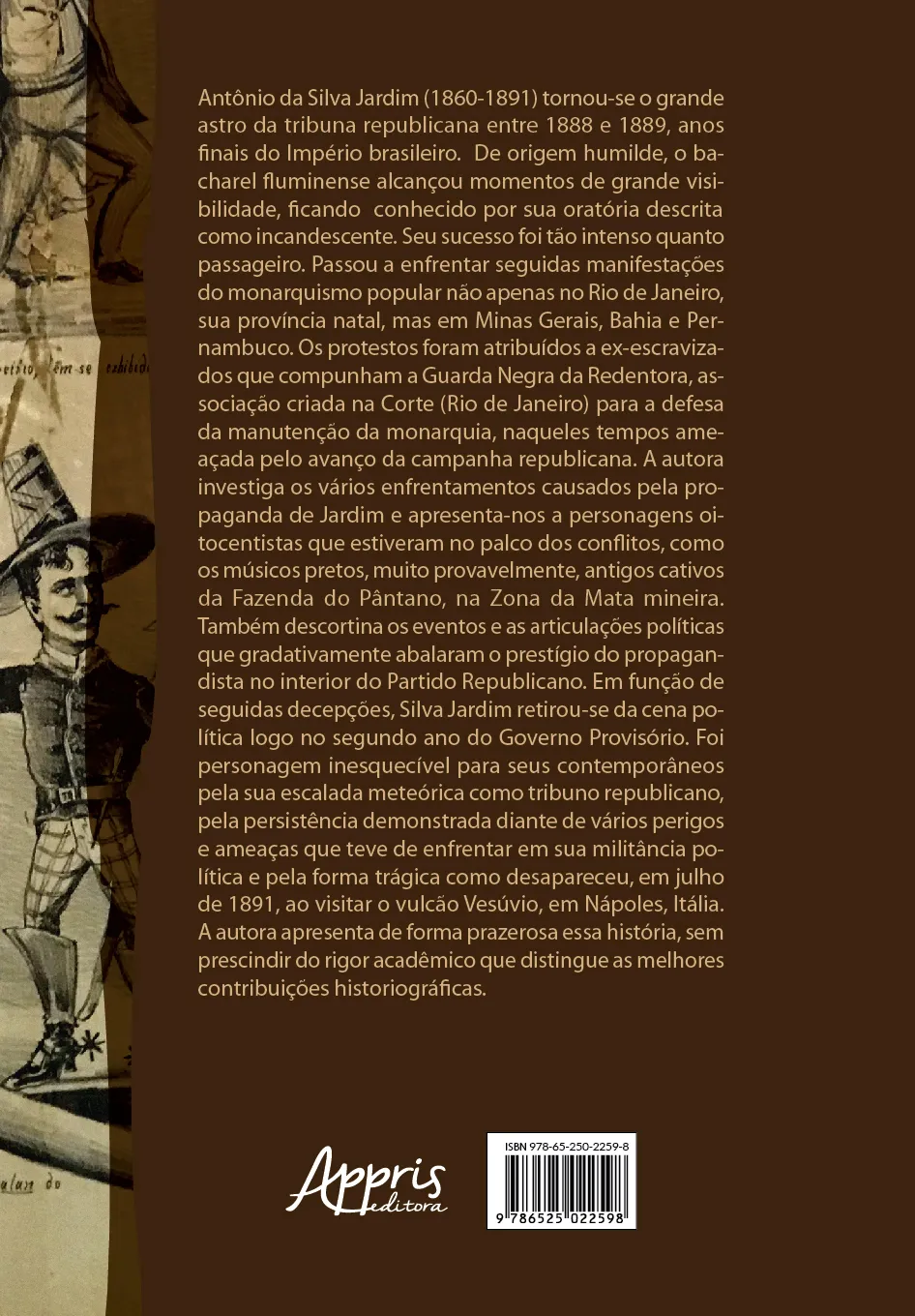 Antônio da Silva Jardim (1860-1891) tornou-se o grande astro da tribuna republicana entre 1888 e 1889, anos finais do Império brasileiro. De origem humilde, o bacharel fluminense alcançou momentos de grande visibilidade, ficando conhecido por sua oratória descrita como incandescente. Seu sucesso foi tão intenso quanto passageiro. Passou a enfrentar seguidas manifestações do monarquismo popular não apenas no Rio de Janeiro, sua província natal, mas em Minas Gerais, Bahia e Pernambuco. Os protestos foram atribuídos a ex-escravizados que compunham a Guarda Negra da Redentora, associação criada na Corte (Rio de Janeiro) para a defesa da manutenção da monarquia, naqueles tempos ameaçada pelo avanço da campanha republicana. A autora investiga os vários enfrentamentos causados pela propaganda de Jardim e apresenta-nos a personagens oitocentistas que estiveram no palco dos conflitos, como os músicos pretos, muito provavelmente, antigos cativos da Fazenda do Pântano, na Zona da Mata mineira. Também descortina os eventos e as articulações políticas que gradativamente abalaram o prestígio do propagandista no interior do Partido Republicano. Em função de seguidas decepções, Silva Jardim retirou-se da cena política logo no segundo ano do Governo Provisório. Foi personagem inesquecível para seus contemporâneos pela sua escalada meteórica como tribuno republicano, pela persistência demonstrada diante de vários perigos e ameaças que teve de enfrentar em sua militância política e pela forma trágica como desapareceu, em julho de 1891, ao visitar o vulcão Vesúvio, em Nápoles, Itália. A autora apresenta de forma prazerosa essa história, sem prescindir do rigor acadêmico que distingue as melhores contribuições historiográficas.