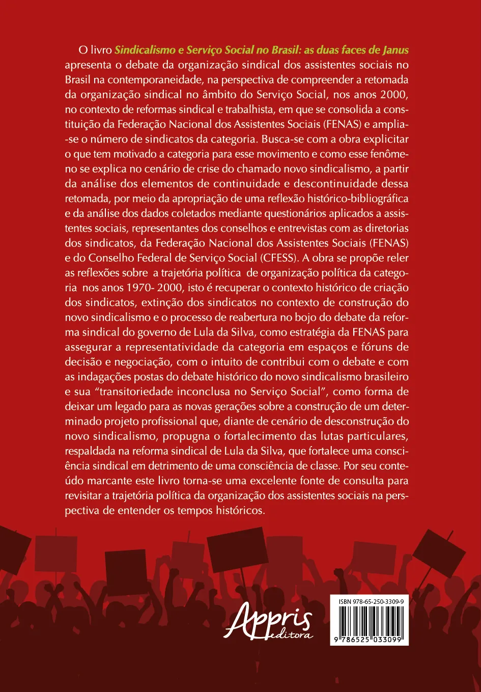 O livro Sindicalismo e Serviço Social no Brasil: as duas faces de Janus apresenta o debate da organização sindical dos assistentes sociais no Brasil na contemporaneidade, na perspectiva de compreender a retomada da organização sindical no âmbito do Serviço Social, nos anos 2000, no contexto de reformas sindical e trabalhista, em que se consolida a constituição da Federação Nacional dos Assistentes Sociais (FENAS) e amplia-se o número de sindicatos da categoria. Busca-se com a obra explicitar o que tem motivado a categoria para esse movimento e como esse fenômeno se explica no cenário de crise do chamado novo sindicalismo, a partir da análise dos elementos de continuidade e descontinuidade dessa retomada, por meio da apropriação de uma reflexão histórico-bibliográfica e da análise dos dados coletados mediante questionários aplicados a assistentes sociais, representantes dos conselhos e entrevistas com as diretorias dos sindicatos, da Federação Nacional dos Assistentes Sociais (FENAS) e do Conselho Federal de Serviço Social (CFESS). A obra se propõe reler as reflexões sobre a trajetória política de organização política da categoria nos anos 1970- 2000, isto é recuperar o contexto histórico de criação dos sindicatos, extinção dos sindicatos no contexto de construção do novo sindicalismo e o processo de reabertura no bojo do debate da reforma sindical do governo de Lula da Silva, como estratégia da FENAS para assegurar a representatividade da categoria em espaços e fóruns de decisão e negociação, com o intuito de contribui com o debate e com as indagações postas do debate histórico do novo sindicalismo brasileiro e sua “transitoriedade inconclusa no Serviço Social”, como forma de deixar um legado para as novas gerações sobre a construção de um determinado projeto profissional que, diante de cenário de desconstrução do novo sindicalismo, propugna o fortalecimento das lutas particulares, respaldada na reforma sindical de Lula da Silva, que fortalece uma consciência sindical em detrimento de uma consciência de classe. Por seu conteúdo marcante este livro torna-se uma excelente fonte de consulta para revisitar a trajetória política da organização dos assistentes sociais na perspectiva de entender os tempos históricos.