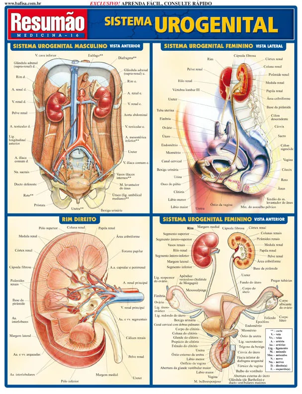 Oito imagens de alta definição, com dezenas de identificações anatômicas dos órgãos que fazem parte do sistema urogenital. Vista lateral e detalhamento do sistema urogenital feminino. Vista lateral e detalhamento do sistema urogenital masculino. O sistema urinário masculino. Para completar: imagens do rim direito, do corpúsculo renal e do néfron.