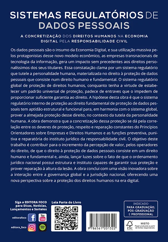 Os dados pessoais são o insumo da Economia Digital, e sua utilização massiva pelos protagonistas desse novo modelo econômico, as empresas transnacionais de tecnologia da informação, gera um impacto sem precedentes aos direitos personalíssimos dos seus titulares. Essa constatação clama por um sistema regulatório que tutele a personalidade humana, materializada no direito à proteção de dados pessoais que consiste num direito humano e fundamental. O sistema regulatório global de proteção de direitos humanos, conquanto tenha a virtude de estabelecer um padrão universal de proteção, padece de entraves que o impedem de proporcionar suficiente garantia ao direito. A hipótese desta obra é que o sistema regulatório interno de proteção ao direito fundamental de proteção de dados pessoais tem aptidão estrutural e funcional para, em harmonia com o sistema global, prover a almejada proteção desse direito, no contexto da tutela da personalidade humana. A obra demonstra que a concretização dessa proteção se dá pela correlação entre os deveres de proteção, respeito e reparação constantes do Princípios Orientadores sobre Empresas e Direitos Humanos e as funções preventiva, punitiva e reparatória do instituto jurídico da responsabilidade civil. O objetivo deste trabalho é contribuir para o incremento da percepção de valor, pelos operadores do direito, de que o direito à proteção de dados pessoais consiste em um direito humano e fundamental e, ainda, lançar luzes sobre o fato de que o ordenamento jurídico nacional possui estrutura e instituto capazes de garantir sua proteção e prover reparação à altura da lesão. A obra conclui com uma visão inovadora sobre a interação entre a governança global e a jurisdição nacional, oferecendo uma nova perspectiva sobre a proteção dos direitos humanos na era digital.