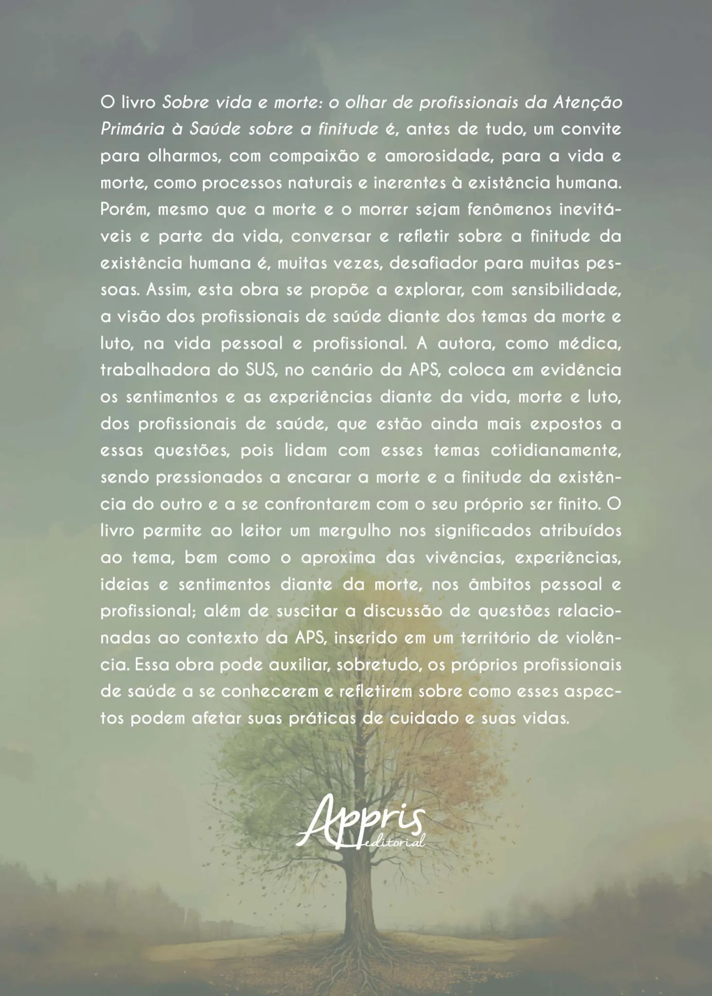 O livro Sobre vida e morte: o olhar de profissionais da Atenção Primária à Saúde sobre a finitude é, antes de tudo, um convite para olharmos, com compaixão e amorosidade, para a vida e morte, como processos naturais e inerentes à existência humana. Porém, mesmo que a morte e o morrer sejam fenômenos inevitáveis e parte da vida, conversar e refletir sobre a finitude da existência humana é, muitas vezes, desafiador para muitas pessoas. Assim, esta obra se propõe a explorar, com sensibilidade, a visão dos profissionais de saúde diante dos temas da morte e luto, na vida pessoal e profissional. A autora, como médica, trabalhadora do SUS, no cenário da APS, coloca em evidência os sentimentos e as experiências diante da vida, morte e luto, dos profissionais de saúde, que estão ainda mais expostos a essas questões, pois lidam com esses temas cotidianamente, sendo pressionados a encarar a morte e a finitude da existência do outro e a se confrontarem com o seu próprio ser finito. O livro permite ao leitor um mergulho nos significados atribuídos ao tema, bem como o aproxima das vivências, experiências, ideias e sentimentos diante da morte, nos âmbitos pessoal e profissional; além de suscitar a discussão de questões relacionadas ao contexto da APS, inserido em um território de violência. Essa obra pode auxiliar, sobretudo, os próprios profissionais de saúde a se conhecerem e refletirem sobre como esses aspectos podem afetar suas práticas de cuidado e suas vidas.