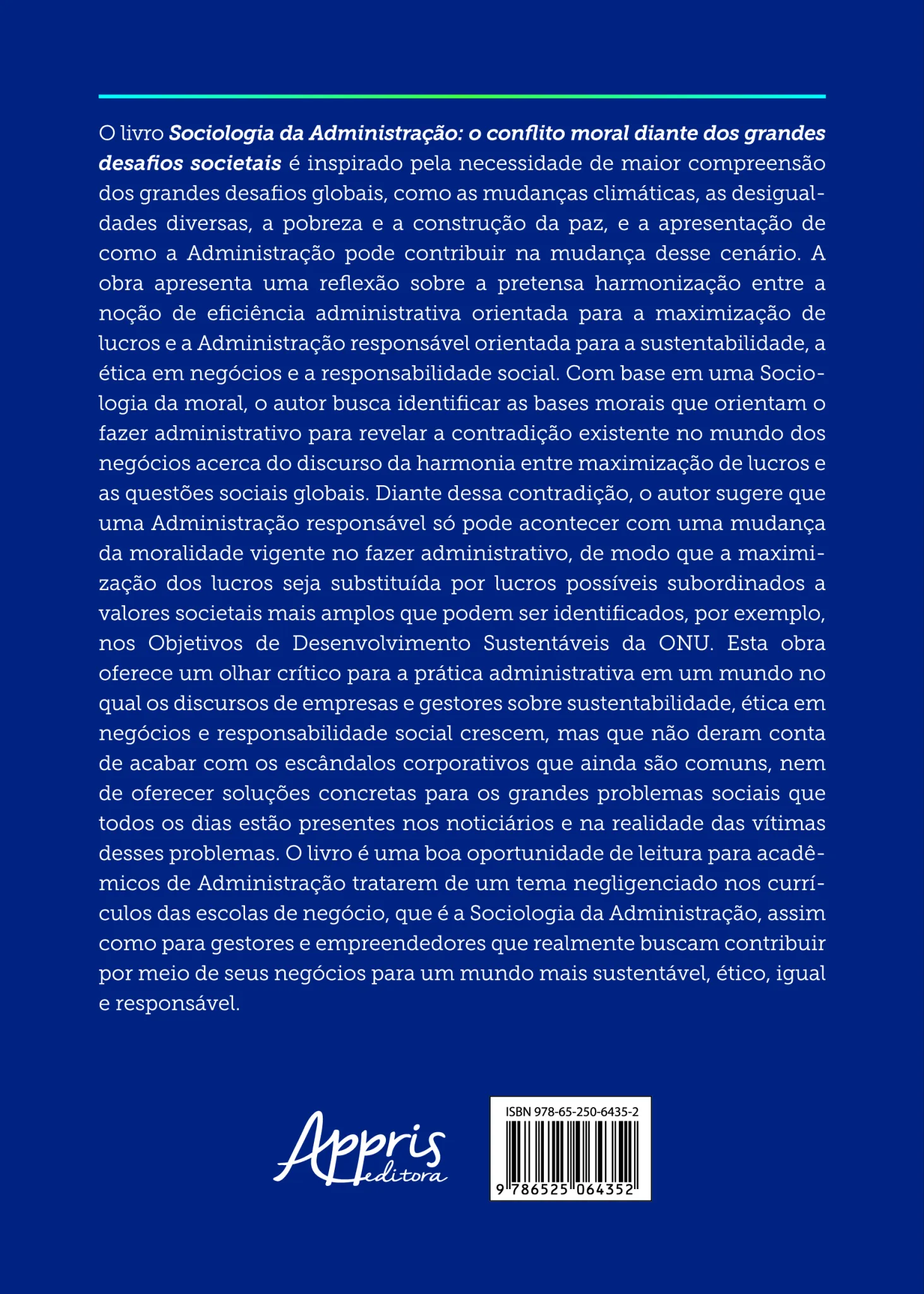 O livro Sociologia da Administração: o conflito moral diante dos grandes desafios societais é inspirado pela necessidade de maior compreensão dos grandes desafios globais, como as mudanças climáticas, as desigualdades diversas, a pobreza e a construção da paz, e a apresentação de como a Administração pode contribuir na mudança desse cenário. A obra apresenta uma reflexão sobre a pretensa harmonização entre a noção de eficiência administrativa orientada para a maximização de lucros e a Administração responsável orientada para a sustentabilidade, a ética em negócios e a responsabilidade social. Com base em uma Sociologia da moral, o autor busca identificar as bases morais que orientam o fazer administrativo para revelar a contradição existente no mundo dos negócios acerca do discurso da harmonia entre maximização de lucros e as questões sociais globais. Diante dessa contradição, o autor sugere que uma Administração responsável só pode acontecer com uma mudança da moralidade vigente no fazer administrativo, de modo que a maximização dos lucros seja substituída por lucros possíveis subordinados a valores societais mais amplos que podem ser identificados, por exemplo, nos Objetivos de Desenvolvimento Sustentáveis da ONU. Esta obra oferece um olhar crítico para a prática administrativa em um mundo no qual os discursos de empresas e gestores sobre sustentabilidade, ética em negócios e responsabilidade social crescem, mas que não deram conta de acabar com os escândalos corporativos que ainda são comuns, nem de oferecer soluções concretas para os grandes problemas sociais que todos os dias estão presentes nos noticiários e na realidade das vítimas desses problemas. O livro é uma boa oportunidade de leitura para acadêmicos de Administração tratarem de um tema negligenciado nos currículos das escolas de negócio, que é a Sociologia da Administração, assim como para gestores e empreendedores que realmente buscam contribuir por meio de seus negócios para um mundo mais sustentável, ético, igual e responsável.