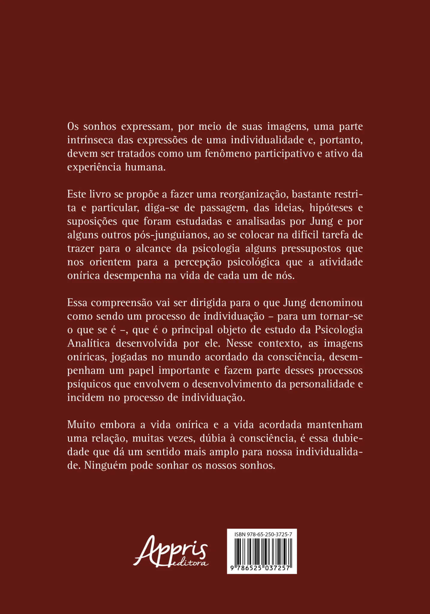 Este livro se propõe a fazer uma reorganização, bastante restrita e particular, diga-se de passagem, das ideias, hipóteses e suposições que foram estudadas e analisadas por Jung e por alguns outros pós-junguianos, ao se colocar na difícil tarefa de trazer para o alcance da psicologia alguns pressupostos que nos orientem para a percepção psicológica que a atividade onírica desempenha na vida de cada um de nós.