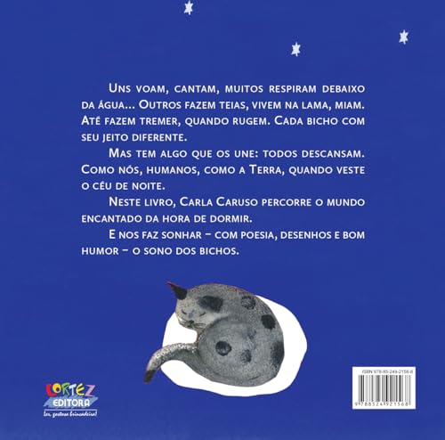 Alguns bichos voam, uns cantam, muitos respiram debaixo da água… Outros fazem teias, mudam de pele, vivem na lama. Latem, miam. Até fazem tremer, quando rugem! Cada bicho com seu jeito diferente, mas há algo que os une: todos descansam. Como nós, humanos, como a terra, quando veste o céu de noite…