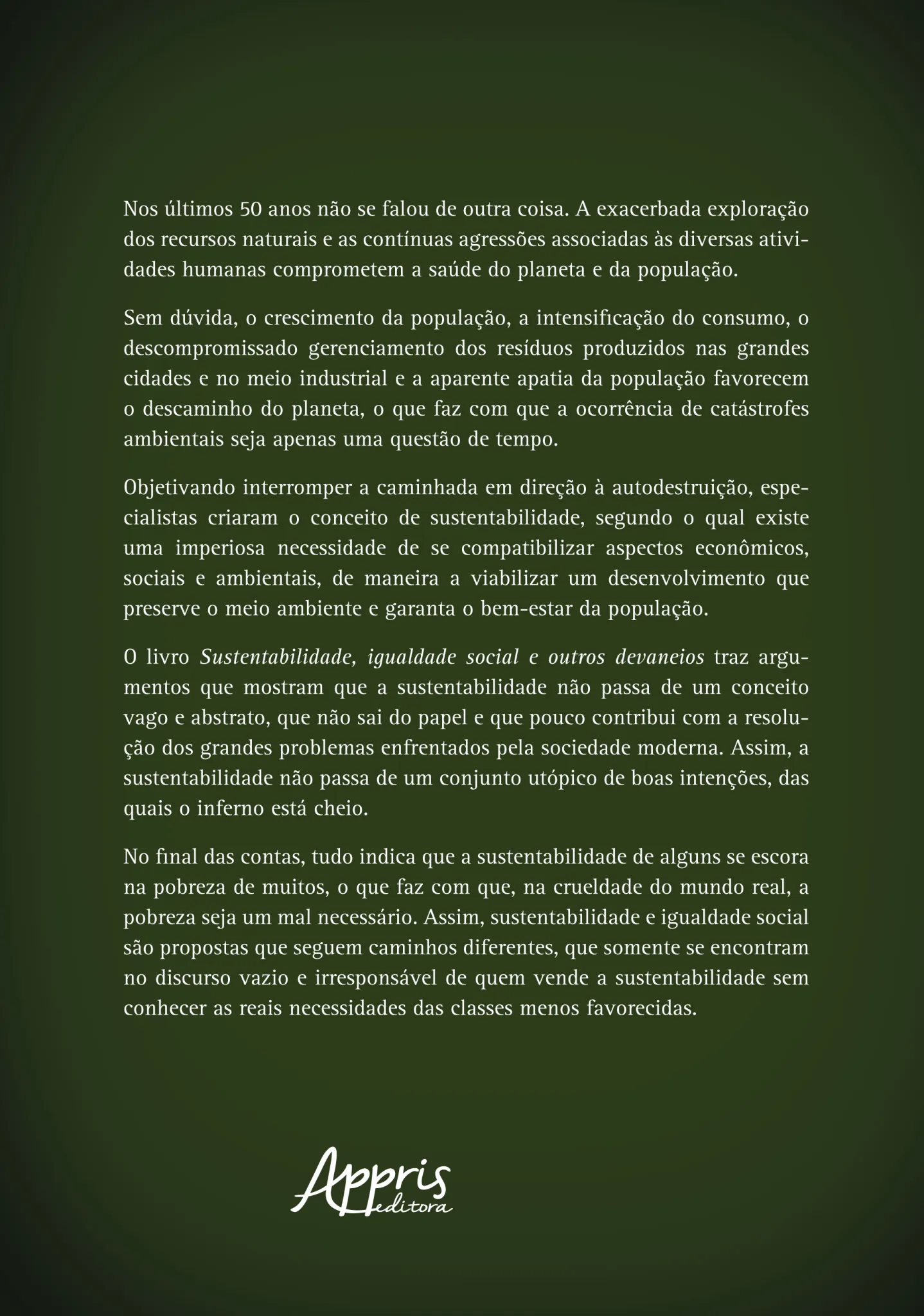 O livro Sustentabilidade, igualdade social e outros devaneios traz argumentos que mostram que a sustentabilidade não passa de um conceito vago e abstrato, que não sai do papel e que pouco contribui com a resolução dos grandes problemas enfrentados pela sociedade moderna. Assim, a sustentabilidade não passa de um conjunto utópico de boas intenções, das quais o inferno está cheio.