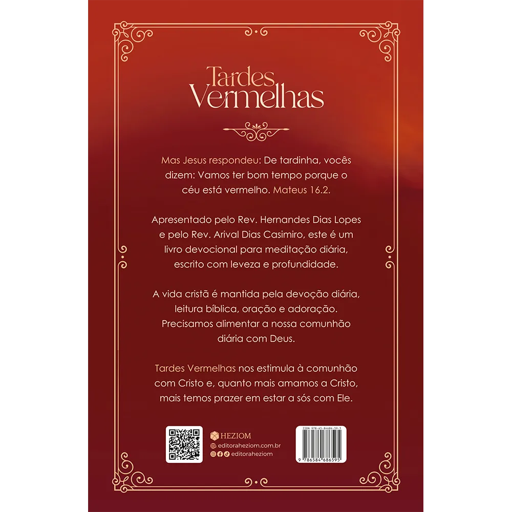 Apresentado pelo Rev. Hernandes Dias Lopes e pelo Rev. Arival Dias Casimiro, este é um livro devocional para meditação diária, escrito com leveza e profundidade. A vida cristã é mantida pela devoção diária, leitura bíblica, oração e adoração. Precisamos alimentar a nossa comunhão diária com Deus. “Tardes Vermelhas” nos estimula à comunhão com Cristo, e quanto mais amamos a Cristo, mais temos prazer em estar a sós com Ele.