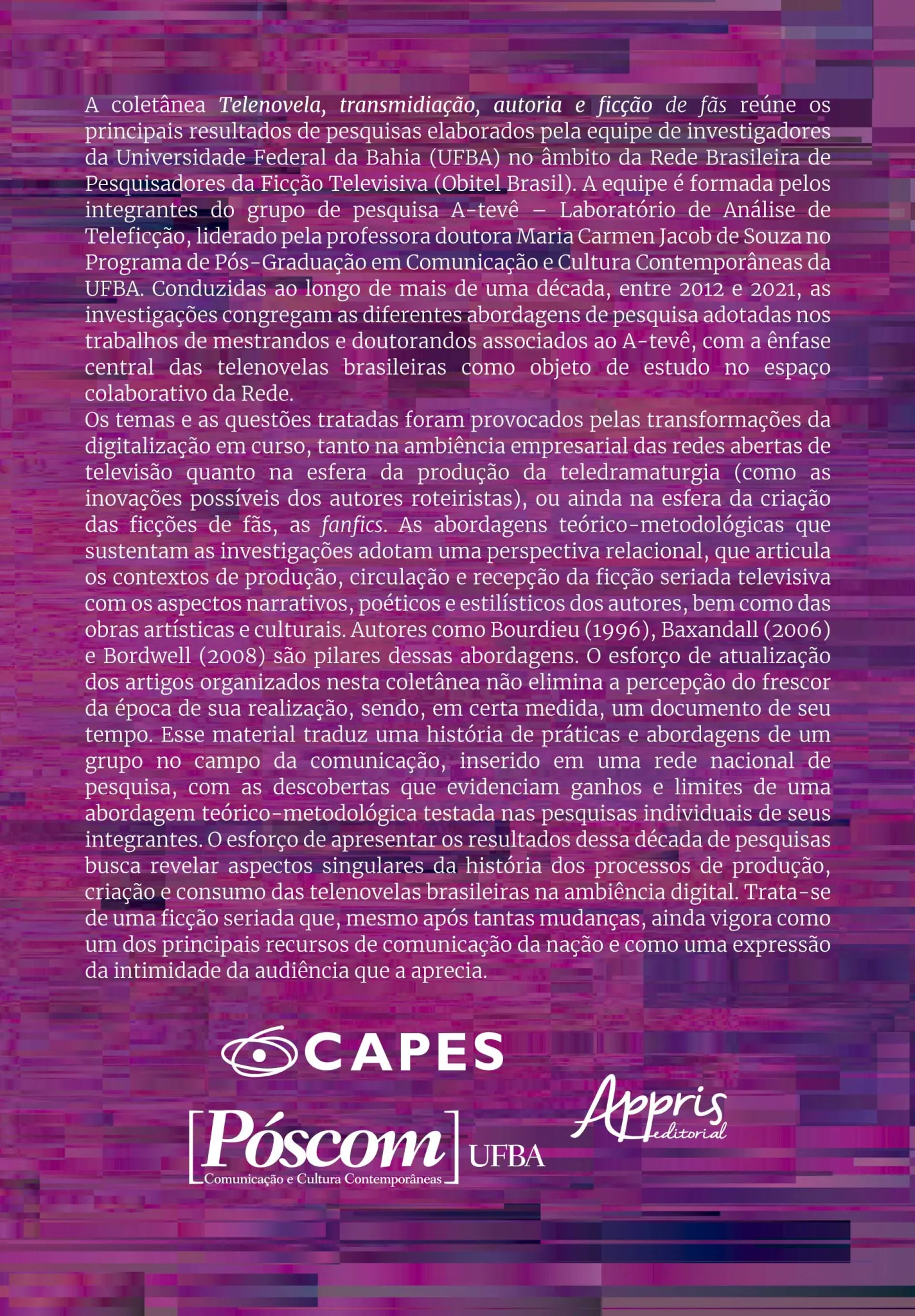 A coletânea Telenovela, transmidiação, autoria e ficção de fãs reúne os principais resultados de pesquisas elaborados pela equipe de investigadores da Universidade Federal da Bahia (UFBA) no âmbito da Rede Brasileira de Pesquisadores da Ficção Televisiva (Obitel Brasil). A equipe é formada pelos integrantes do grupo de pesquisa A-tevê – Laboratório de Análise de Teleficção, liderado pela professora doutora Maria Carmen Jacob de Souza no Programa de Pós-Graduação em Comunicação e Cultura Contemporâneas da UFBA. Conduzidas ao longo de mais de uma década, entre 2012 e 2021, as investigações congregam as diferentes abordagens de pesquisa adotadas nos trabalhos de mestrandos e doutorandos associados ao A-tevê, com a ênfase central das telenovelas brasileiras como objeto de estudo no espaço colaborativo da Rede.