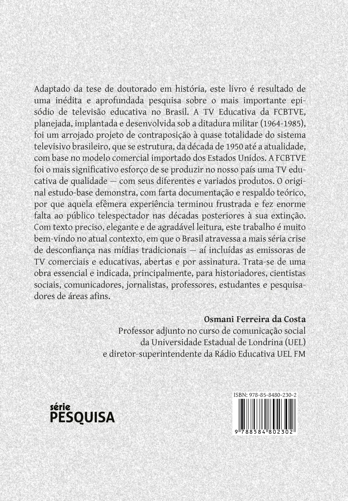 Adaptado da tese de doutorado em história, este livro é resultado de uma inédita e aprofundada pesquisa sobre o mais importante episódio de televisão educativa no Brasil. A TV Educativa da FCBTVE, planejada, implantada e desenvolvida sob a ditadura militar (1964-1985), foi um arrojado projeto de contraposição à quase totalidade do sistema televisivo brasileiro, que se estrutura, da década de 1950 até a atualidade, com base no modelo comercial importado dos Estados Unidos. A FCBTVE foi o mais significativo esforço de se produzir no nosso país uma TV educativa de qualidade — com seus diferentes e variados produtos. O original estudo-base demonstra, com farta documentação e respaldo teórico, por que aquela efêmera experiência terminou frustrada e fez enorme falta ao público telespectador nas décadas posteriores à sua extinção. Com texto preciso, elegante e de agradável leitura, este trabalho é muito bem-vindo no atual contexto, em que o Brasil atravessa a mais séria crise de desconfiança nas mídias tradicionais — aí incluídas as emissoras de TV comerciais e educativas, abertas e por assinatura. Trata-se de uma obra essencial e indicada, principalmente, para historiadores, cientistas sociais, comunicadores, jornalistas, professores, estudantes e pesquisadores de áreas afins. Osmani Ferreira da Costa Professor adjunto no curso de comunicação social da Universidade Estadual de Londrina (UEL) e diretor-superintendente da Rádio Educativa UEL FM.