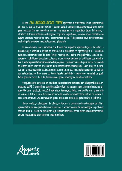 O livro discorre sobre trabalhos que tratam dos aspectos epistemológicos da leitura e trabalhos que abordam a leitura de textos com a finalidade da aprendizagem de conteúdos químicos. Diferentes tipos de texto (artigo, reportagem, história em quadrinhos, literário etc.) devem ser trabalhados em sala de aula para a formação de sentidos e a criticidade dos estudantes. O autor apresenta também dois textos próprios. O primeiro foi usado para iniciar o conteúdo de termoquímica, inserido no contexto da sustentabilidade e biodigestão. Sabe-se que a motivação para a leitura também está relacionada com os textos que contemplam assuntos da vivência dos estudantes; por isso, esses contextos (sustentabilidade e produção de energia), os quais fazem parte do nosso dia a dia, foram usados para a abordagem inicial do conteúdo.