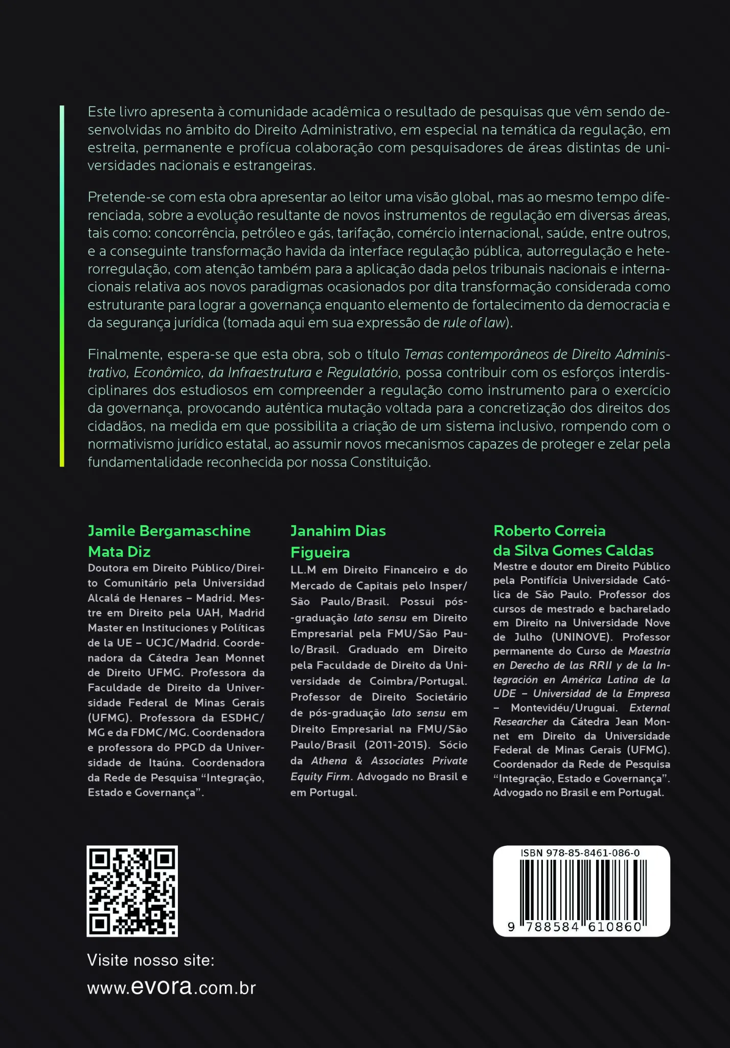 Finalmente, espera-se que esta obra, sob o título Temas contemporâneos de Direito Administrativo, Econômico, da Infraestrutura e Regulatório, possa contribuir com os esforços interdisciplinares dos estudiosos em compreender a regulação como instrumento para o exercício da governança, provocando autêntica mutação voltada para a concretização dos direitos dos cidadãos, na medida em que possibilita a criação de um sistema inclusivo, rompendo com o normativismo jurídico estatal, ao assumir novos mecanismos capazes de proteger e zelar pela fundamentalidade reconhecida por nossa Constituição.