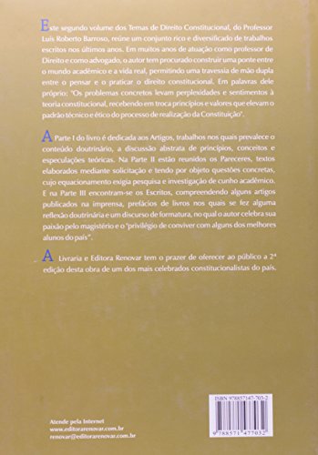 Este segundo volume reúne um conjunto rico e diversificado de trabalhos escritos nos últimos dois anos. Em muitos anos de atuação como professor de Direito e como advogado, o autor tem procurado construir uma ponte entre o mundo acadêmico e a vida real, permitindo uma travessia de mão dupla entre o pensar e o praticar o direito constitucional. Em palavras dele próprio: ´Os problemas concretos levam perplexidades e sentimentos à teoria constitucional, recebendo em troca princípios e valores que elevam o padrão técnico e ético do processo de realização da Constituição´.