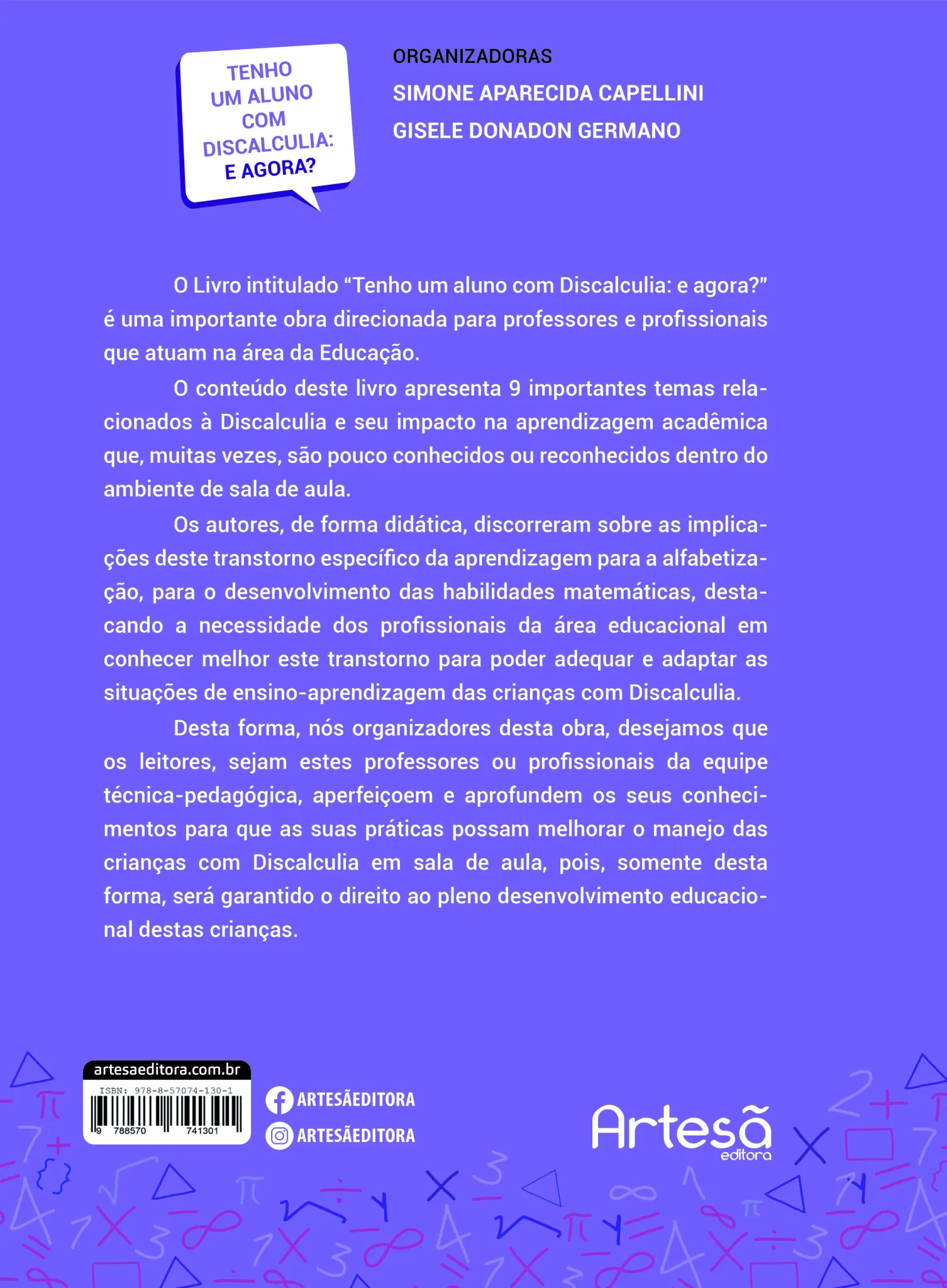 O conteúdo deste livro apresenta 9 importantes temas relacionados à Discalculia e seu impacto na aprendizagem acadêmica que, muitas vezes, são pouco conhecidos ou reconhecidos dentro do ambiente de sala de aula. Os autores, de forma didática, discorreram sobre as implicações deste transtorno específico da aprendizagem para a alfabetização, para o desenvolvimento das habilidades matemáticas, destacando a necessidade dos profissionais da área educacional em conhecer melhor este transtorno para poder adequar e adaptar as situações de ensino-aprendizagem das crianças com Discalculia. Desta forma, nós organizadores desta obra, desejamos que os leitores, sejam estes professores ou profissionais da equipe técnica-pedagógica, aperfeiçoem e aprofundem os seus conhecimentos para que as suas práticas possam melhorar o manejo das crianças com Discalculia em sala de aula, pois, somente desta forma, será garantido o direito ao pleno desenvolvimento educacional
