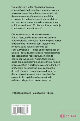 Entre a crônica autobiográfica e o ensaio filosófico, Paul Preciado oferece uma obra radical e visionária sobre gênero e sexualidade no mundo contemporâneo. Entre 2007 e 2008, durante vários meses e ainda com a identidade de Beatriz Preciado, o autor se “intoxicou” por conta própria com testosterona, “reprogramando” seu corpo de feminino para masculino e assim iniciando a travessia para transformar-se em Paul B. Preciado. Mergulhado nesse “experimento político que durou 236 dias e noites”, o filósofo espanhol registra as mudanças físicas e psicológicas que vivenciou, como o engrossamento da voz e o crescimento excessivo de pelos, além de um aumento perceptível no desejo sexual e na agressividade. Usando essa experiência como ponto de partida para desconstruir e questionar as diferenças de gênero como as entendemos hoje, Preciado argumenta que a classificação de gênero masculino-feminino nada mais é do que uma construção sociopolítica imposta com base no reconhecimento social, pois a identidade sexual é uma condição fluida e não estagnada.