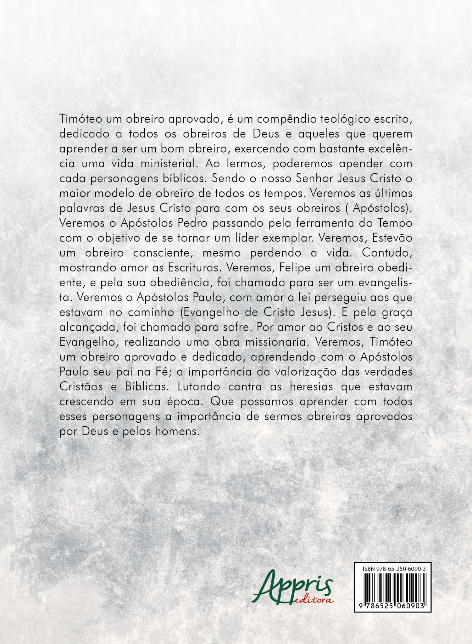 Timóteo um obreiro aprovado, é um compêndio teológico escrito, dedicado a todos os obreiros de Deus e aqueles que querem aprender a ser um bom obreiro, exercendo com bastante excelência uma vida ministerial. Ao lermos, poderemos apender com cada personagens bíblicos. Sendo o nosso Senhor Jesus Cristo o maior modelo de obreiro de todos os tempos. Veremos as últimas palavras de Jesus Cristo para com os seus obreiros ( Apóstolos). Veremos o Apóstolos Pedro passando pela ferramenta do Tempo com o objetivo de se tornar um líder exemplar. Veremos, Estevão um obreiro consciente, mesmo perdendo a vida. Contudo, mostrando amor as Escrituras. Veremos, Felipe um obreiro obediente, e pela sua obediência, foi chamado para ser um evangelista. Veremos o Apóstolos Paulo, com amor a lei perseguiu aos que estavam no caminho (Evangelho de Cristo Jesus). E pela graça alcançada, foi chamado para sofre. Por amor ao Cristos e ao seu Evangelho, realizando uma obra missionaria. Veremos, Timóteo um obreiro aprovado e dedicado, aprendendo com o Apóstolos Paulo seu pai na Fé; a importância da valorização das verdades Cristãos e Bíblicas. Lutando contra as heresias que estavam crescendo em sua época. Que possamos aprender com todos esses personagens a importância de sermos obreiros aprovados por Deus e pelos homens.