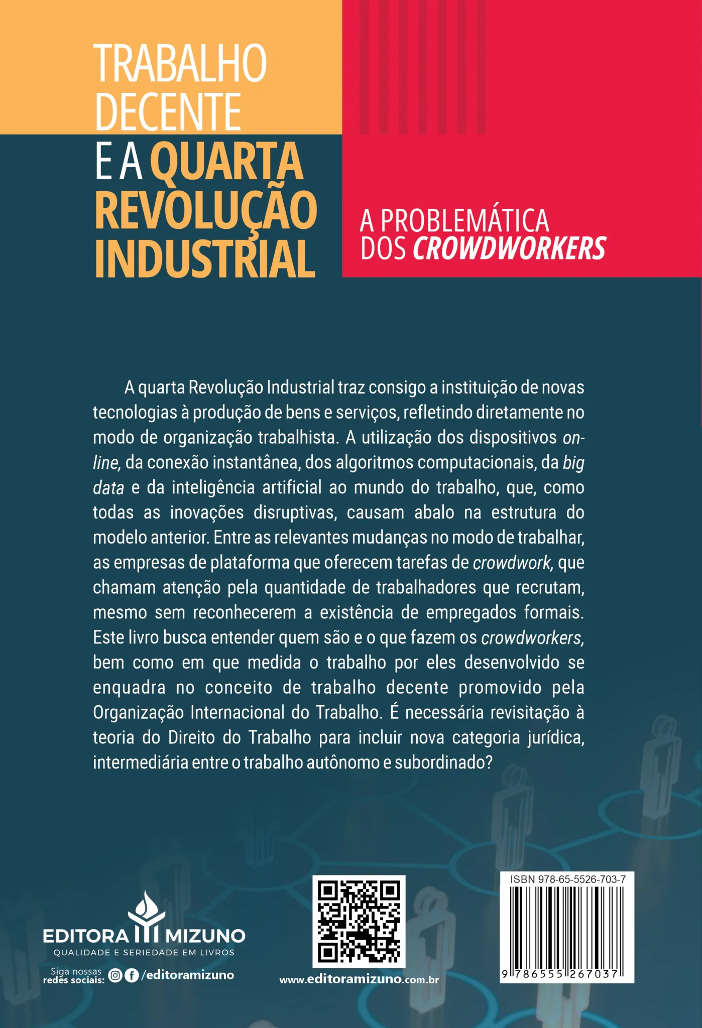 A quarta Revolução Industrial traz consigo a instituição de novas tecnologias à produção de bens e serviços, refletindo diretamente no modo de organização trabalhista. A utilização dos dispositivos on-line, da conexão instantânea, dos algoritmos computacionais, da big data e da inteligência artificial ao mundo do trabalho, que, como todas as inovações disruptivas, causam abalo na estrutura do modelo anterior. Entre as relevantes mudanças no modo de trabalhar, as empresas de plataforma que oferecem tarefas de crowdwork, que chamam atenção pela quantidade de trabalhadores que recrutam, mesmo sem reconhecerem a existência de empregados formais. Este livro busca entender quem são e o que fazem os crowdworkers, bem como em que medida o trabalho por eles desenvolvido se enquadra no conceito de trabalho decente promovido pela Organização Internacional do Trabalho. É necessária revisitação à teoria do Direito do Trabalho para incluir nova categoria jurídica, intermediária entre o trabalho autônomo e subordinado?