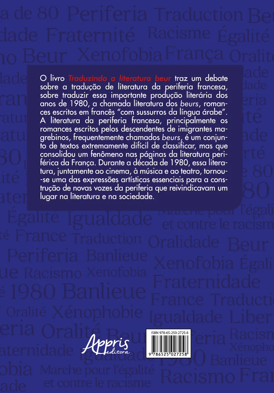 O livro Traduzindo a literatura beur traz um debate sobre a tradução de literatura da periferia francesa, sobre traduzir essa importante produção literária dos anos de 1980, a chamada literatura dos beurs, romances escritos em francês “com sussurros da língua árabe”. A literatura da periferia francesa, principalmente os romances escritos pelos descendentes de imigrantes magrebinos, frequentemente chamados beurs, é um conjunto de textos extremamente difícil de classificar, mas que consolidou um fenômeno nas páginas da literatura periférica da França. Durante a década de 1980, essa literatura, juntamente ao cinema, à música e ao teatro, tornou-se uma das expressões artísticas essenciais para a construção de novas vozes da periferia que reivindicavam um lugar na literatura e na sociedade.