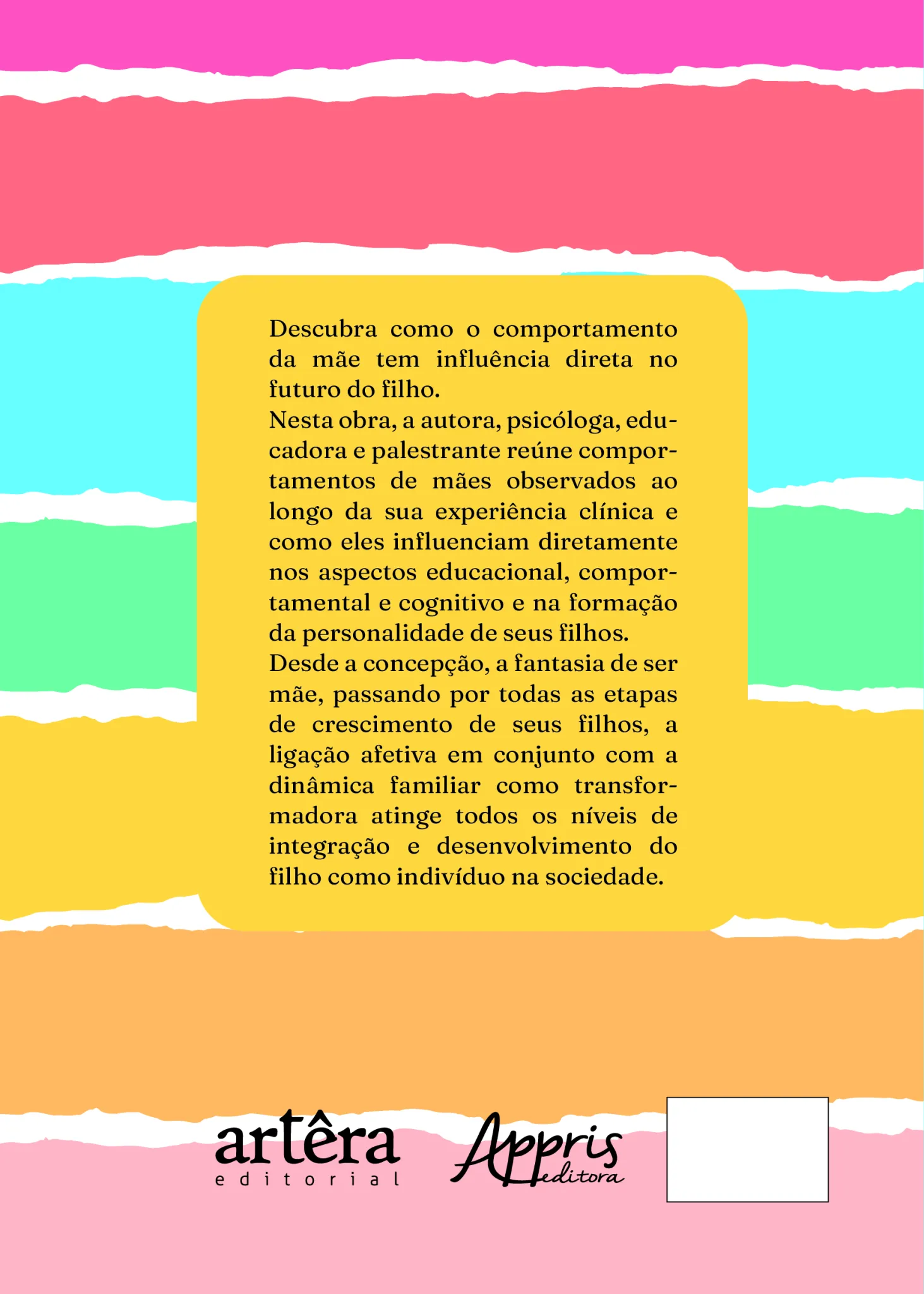 Nesta obra, a autora, psicóloga, educadora e palestrante reúne comportamentos de mães observados ao longo da sua experiência clínica e como eles influenciam diretamente nos aspectos educacional, comportamental e cognitivo e na formação da personalidade de seus filhos. Desde a concepção, a fantasia de ser mãe, passando por todas as etapas de crescimento de seus filhos, a ligação afetiva em conjunto com a dinâmica familiar como transformadora atinge todos os níveis de integração e desenvolvimento do filho como indivíduo na sociedade.