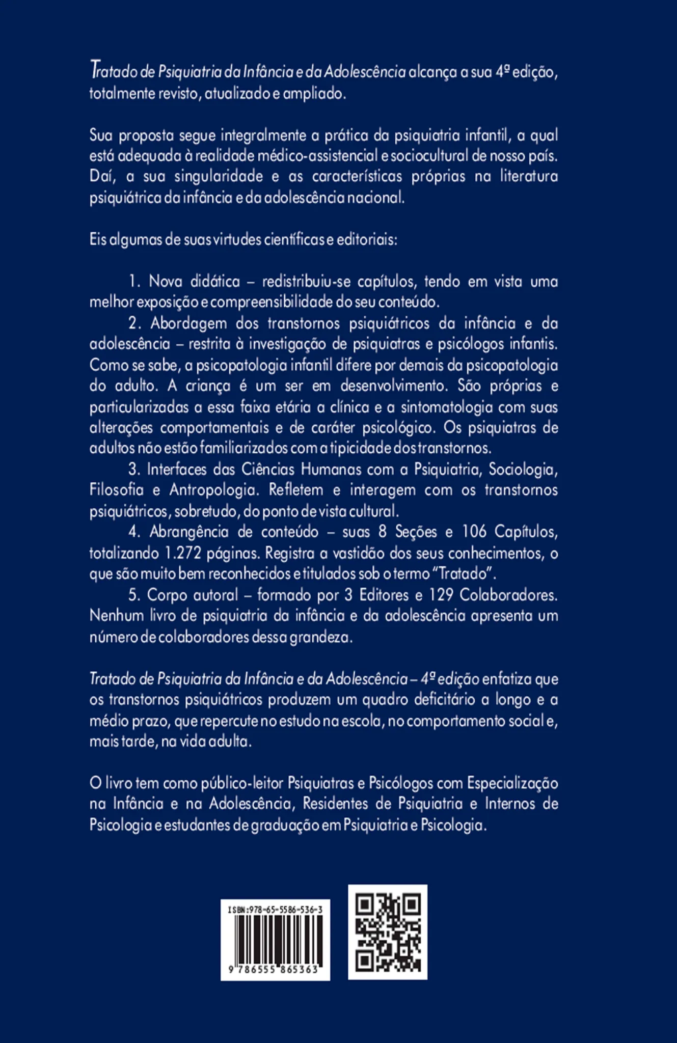 5 – Corpo autoral – formado por 3 Editores e 129 Colaboradores. Nenhum livro de psiquiatria da infância e da adolescência apresenta um número de colaboradores dessa grandeza.