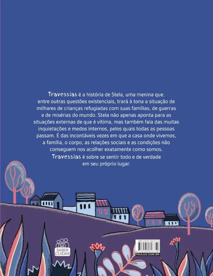 Com linguagem lúdica e imaginativa que desperta a curiosidade do(a) jovem leitor(a), Travessias é uma história narrada por Stela, uma menina que percebe o mundo com o olhar da criança que vive numa terra que não é a sua de origem. Sua condição de filha de uma família de refugiados e também suas características individuais se revelam não apenas por fatos biográficos, mas principalmente através de suas impressões e reflexões.