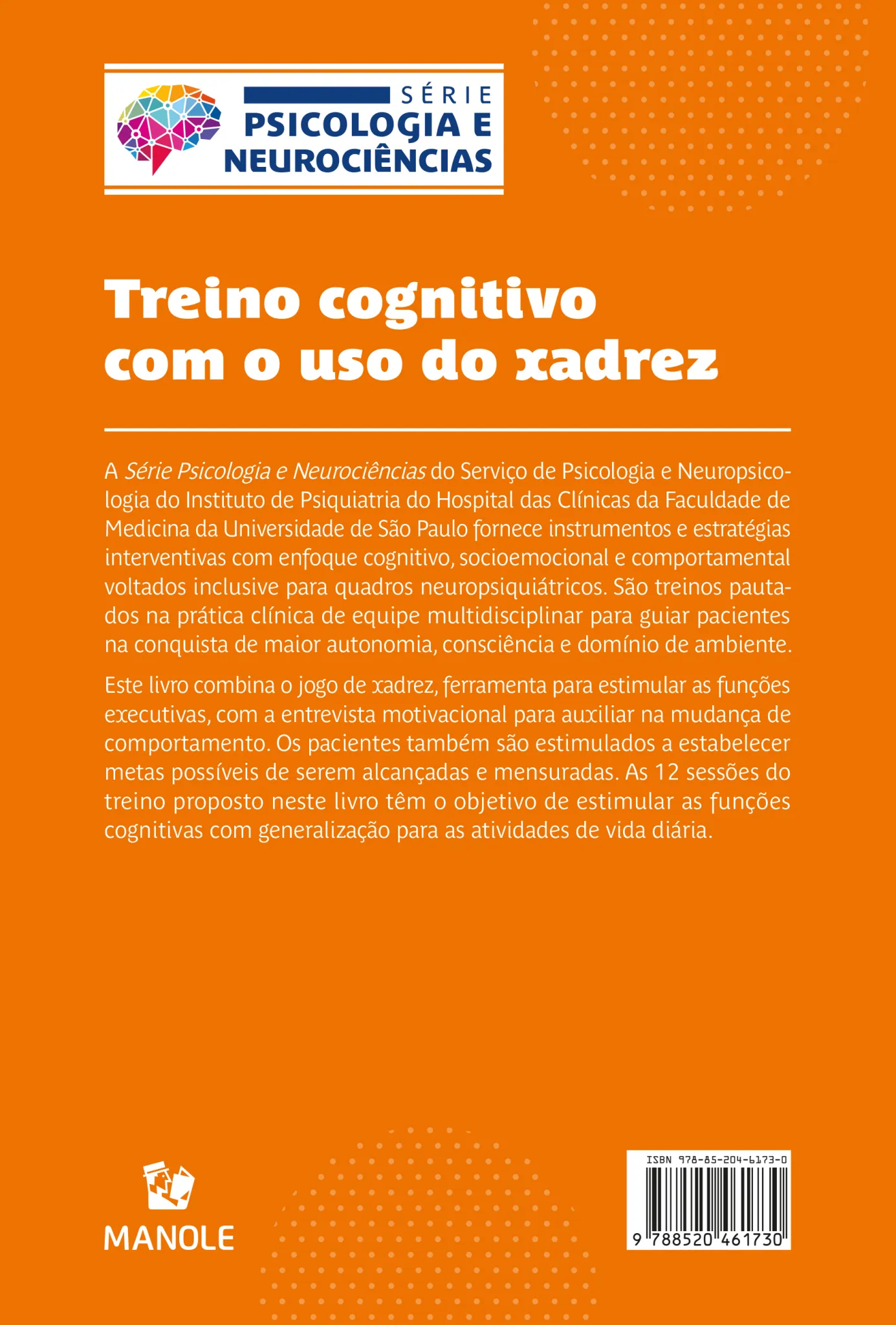 Este livro combina o jogo de xadrez, ferramenta para estimular as funções executivas, com a entrevista motivacional para auxiliar na mudança de comportamento. Os pacientes também são estimulados a estabelecer metas possíveis de serem alcançadas e mensuradas. As 12 sessões do treino proposto neste livro têm o objetivo de estimular as funções cognitivas com generalização para as atividades de vida diária.