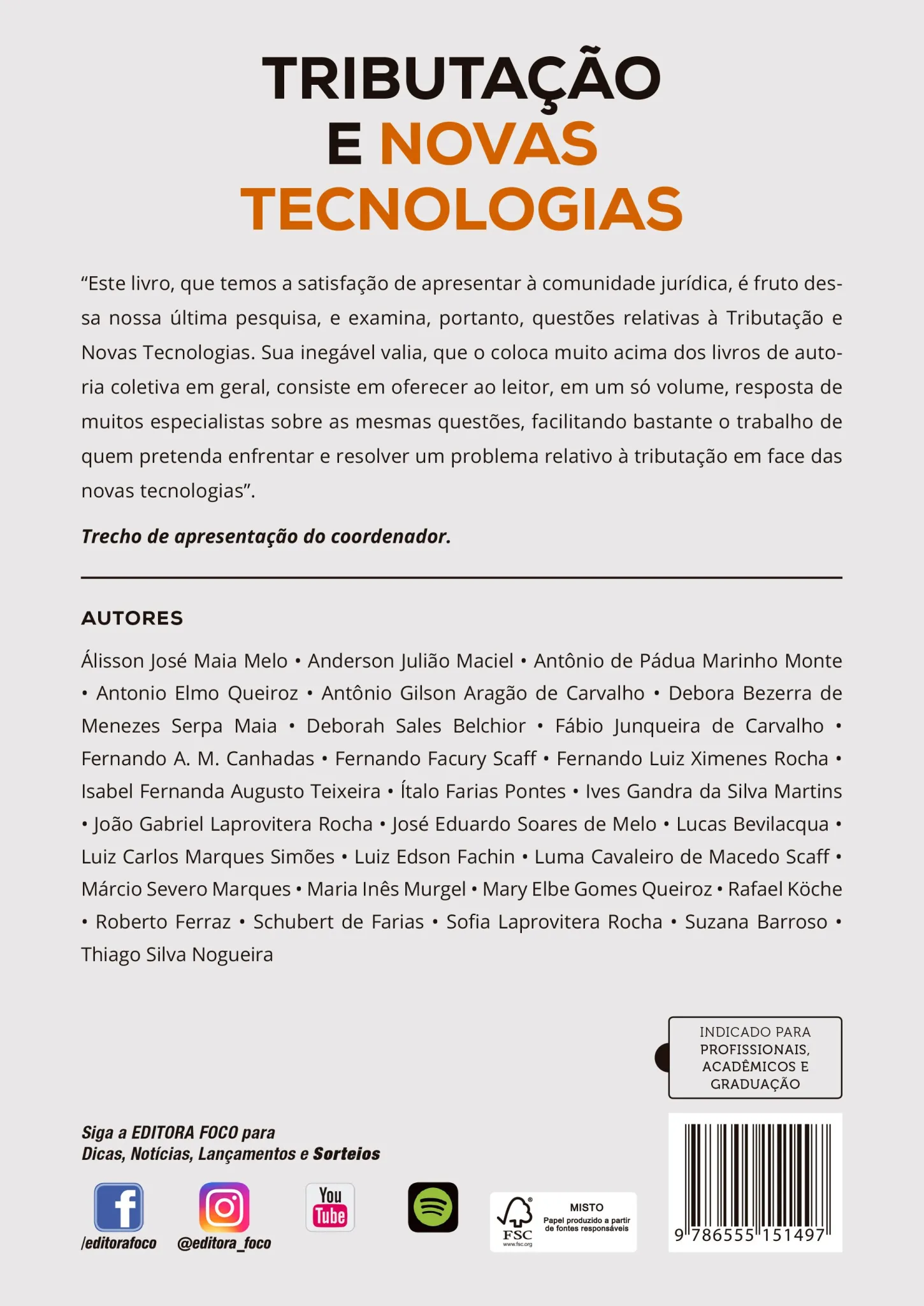 Este livro, que temos a satisfação de apresentar à comunidade jurídica, é fruto dessa nossa última pesquisa, e examina, portanto, questões relativas à Tributação e Novas Tecnologias. Sua inegável valia, que o coloca muito acima dos livros de autoria coletiva em geral, consiste em que oferece ao leitor, em um só volume, resposta de muitos especialistas sobre as mesmas questões, facilitando bastante o trabalho de quem pretenda enfrentar e resolver um problema relativo à tributação em face das novas tecnologias.