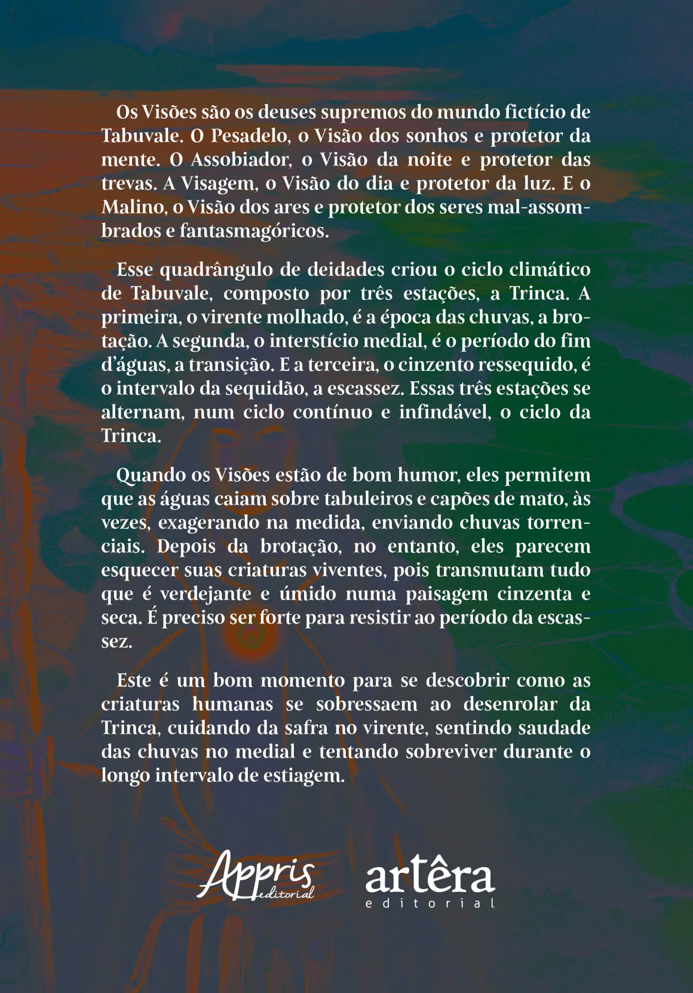 Quando os Visões estão de bom humor, eles permitem que as águas caiam sobre tabuleiros e capões de mato, às vezes, exagerando na medida, enviando chuvas torrenciais. Depois da brotação, no entanto, eles parecem esquecer suas criaturas viventes, pois transmutam tudo que é verdejante e úmido numa paisagem cinzenta e seca. É preciso ser forte para resistir ao período da escassez. Este é um bom momento para se descobrir como as criaturas humanas se sobressaem ao desenrolar da Trinca, cuidando da safra no virente, sentindo saudade das chuvas no medial e tentando sobreviver durante o longo intervalo de estiagem.