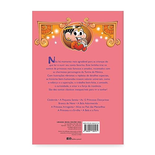 Não há momento mais agradável para as crianças do que ler e ouvir seu conto favorito. Este livrinho traz os contos das princesas mais famosas e amadas, recontados com as charmosas personagens da Turma da Mônica. Com ilustrações vibrantes e repletas de detalhes especiais, as histórias bem-humoradas trazem valores universais, como o esforço e a superação, o trabalho bem-feito, a amizade, a curiosidade, o amor e a força da inocência. São contos clássicos inesquecíveis para rir e sonhar: Cinderela A Pequena Sereia As 12 Princesas Dançarinas Branca de Neve A Bela Adormecida A Princesa Arrogante Alice no País das Maravilhas A Princesa e a Ervilha A Bela e a Fera