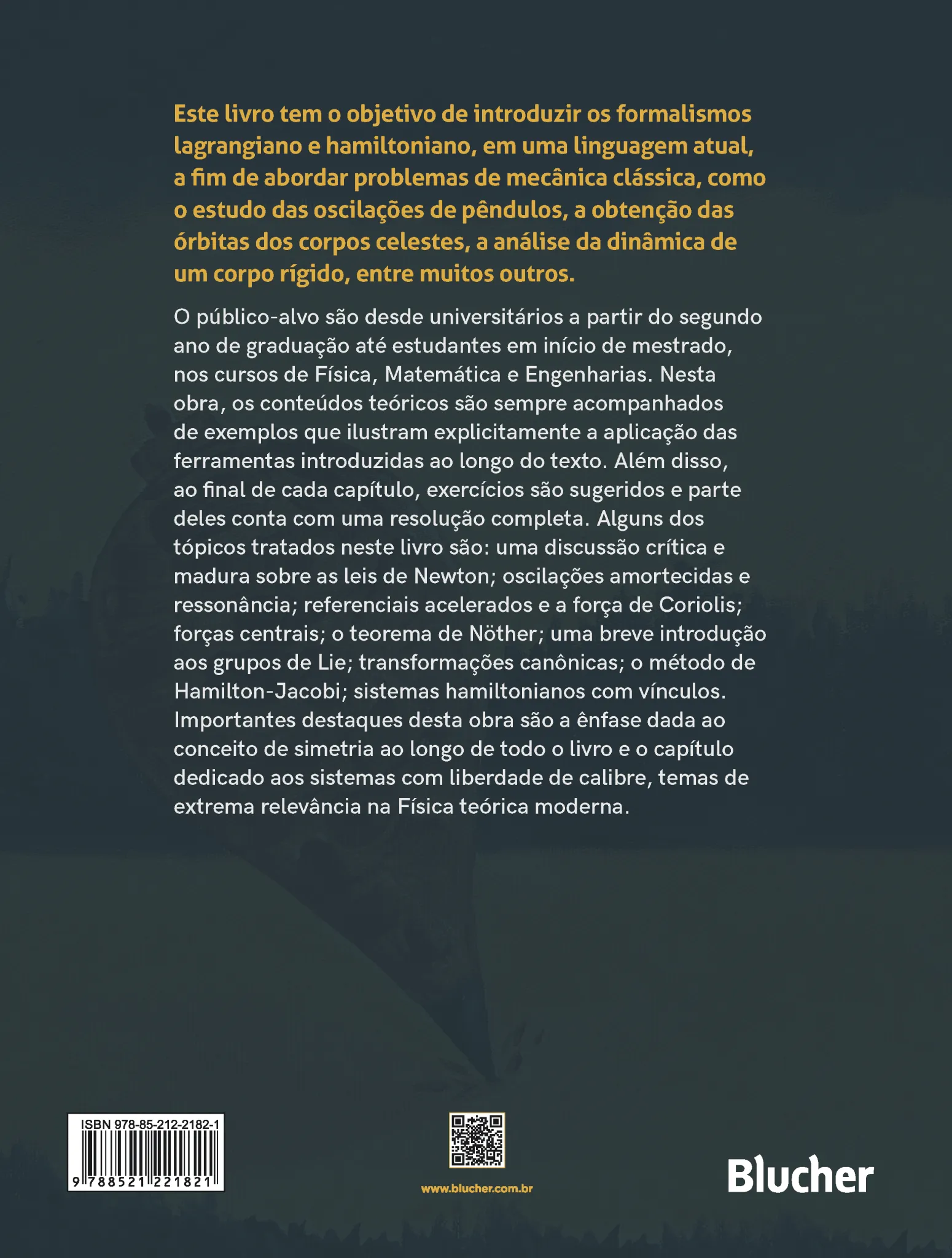 Este livro tem o objetivo de introduzir os formalismos lagrangiano e hamiltoniano, através de um linguagem atual, a fim de abordar problemas de mecânica clássica, tais como o estudo das oscilações de pêndulos, a obtenção das órbitas dos corpos celestes, a análise da dinâmica de um corpo rígido, entre muitos outros.O público-alvo são universitários a partir do segundo ano de graduação até estudantes em início de mestrado, nos cursos de Física, Matemática e Engenharias. Nesta obra, os conteúdos teóricos são sempre acompanhados de exemplos que ilustram explicitamente a aplicação das ferramentas introduzidas ao longo do texto. Além disso, ao final de cada capítulo, exercícios são sugeridos e parte deles conta com uma resolução completa. Alguns dos tópicos tratados neste livro são: uma discussão crítica e madura sobre as leis de Newton; oscilações amortecidas e ressonância; referenciais acelerados e a força de Coriolis; forças centrais; o teorema de Nöther; uma breve introdução aos grupos de Lie; transformações canônicas; o método de Hamilton-Jacobi; sistemas hamiltonianos com vínculos. Importantes destaques desta obra são a ênfase dada ao conceito de simetria ao longo de todo o livro e o capítulo dedicado aos sistemas com liberdade de calibre, temas de extrema relevância na Física teórica moderna.