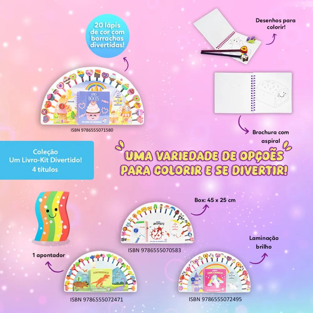 Um livro-kit divertido que encoraja as crianças a realizar os primeiros traços com referência em simpáticos unicórnios. Basta seguir o fácil passo a passo a partir do aprendizado de linhas e contornos básicos. Arrisque alguns rabiscos e, quando você se der conta, já terá se tornado um grande artista! Acompanha 20 lápis de cor, 20 borrachas recortadas e coloridas e 1 apontador.