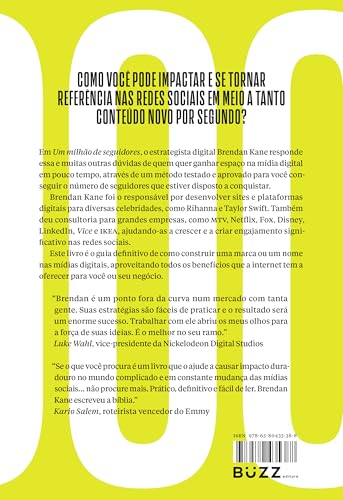 Em Um milhão de seguidores, o estrategista digital Brendan Kane responde essa e muitas outras dúvidas de quem quer ganhar espaço na mídia digital em pouco tempo, através de um método testado e aprovado para você conseguir o número de seguidores que estiver disposto a conquistar. Brendan Kane foi o responsável por desenvolver sites e plataformas digitais para diversas celebridades, como Rihanna e Taylor Swift. Também deu consultoria para grandes empresas, como MTV, Netflix, Fox, Disney, LinkedIn, Vice e Ikea, ajudando-as a crescer e a criar engajamento significativo nas redes sociais. Este livro é o guia definitivo de como construir uma marca ou um nome nas mídias digitais, aproveitando todos os benefícios que a internet tem a oferecer para você ou seu negócio. “Brendan é um ponto fora da curva num mercado com tanta gente. Suas estratégias são fáceis de praticar e o resultado será um enorme sucesso. Trabalhar com ele abriu os meus olhos para a força de suas ideias. É o melhor no seu ramo.” Luke Wahl, produtor executivo da Sports Illustrated e do Yahoo! “Se o que você procura é um livro que o ajude a causar impacto duradouro no mundo complicado e em constante mudança das mídias sociais… não procure mais. Prático, definitivo e fácil de ler. Brendan Kane escreveu a bíblia.” Kario Salem, roteirista vencedor do Emmy.