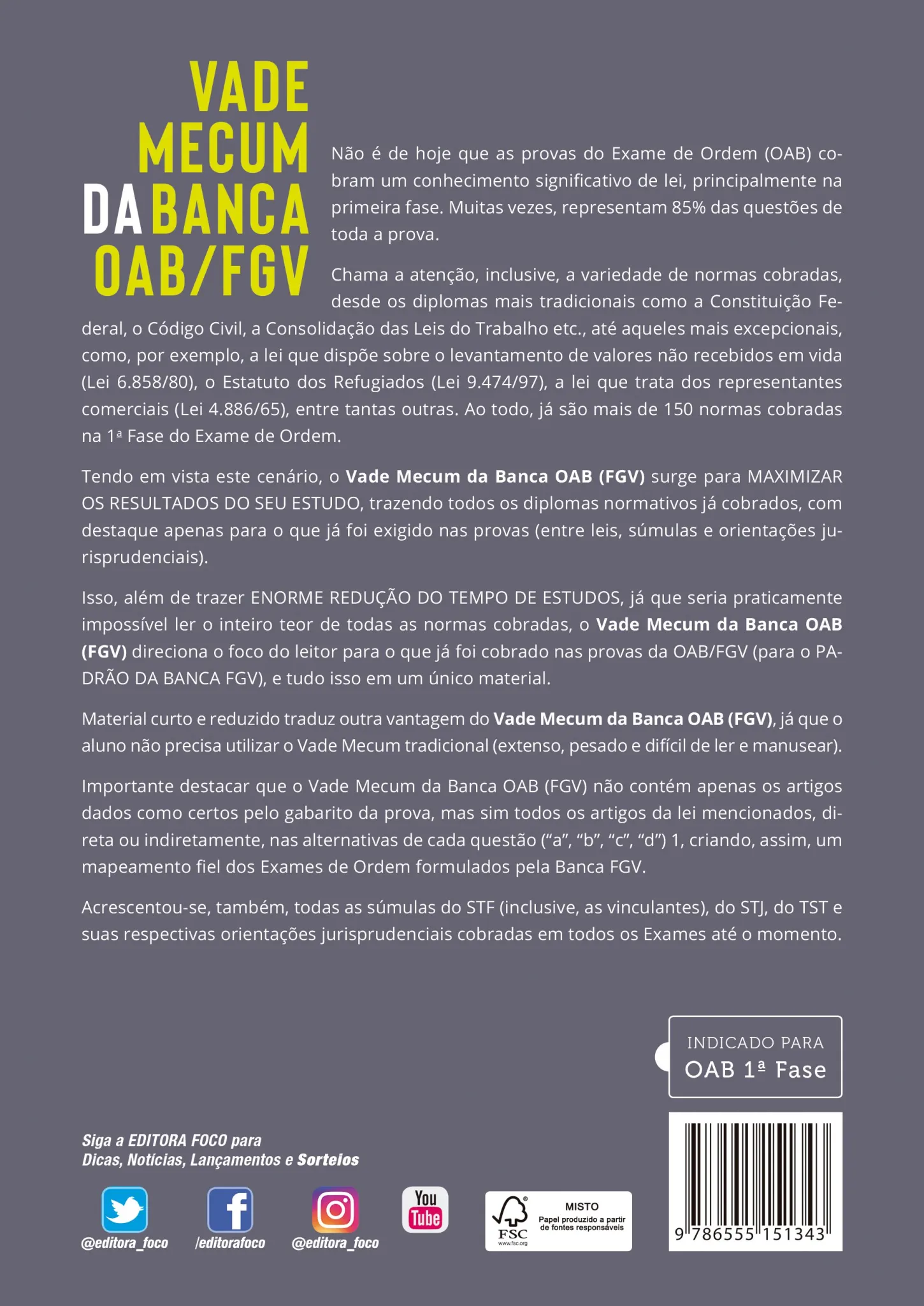 Tendo em vista este cenário, o Vade Mecum da Banca OAB (FGV) surge para MAXIMIZAR OS RESULTADOS DO SEU ESTUDO, trazendo todos os diplomas normativos já cobrados, com destaque apenas para o que já foi exigido nas provas (entre leis, súmulas e orientações jurisprudenciais).