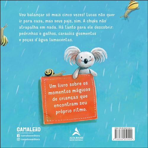 Vou balançar só mais cinco vezes! Lucas não quer ir para casa, mas seus pais, sim. A chuva não atrapalha em nada. Há tanto para ele descobrir: pedrinhas e galhos, caracóis gosmentos e poças d’água lamacentas. Um livro sobre os momentos mágicos de crianças que encontram seu próprio ritmo.