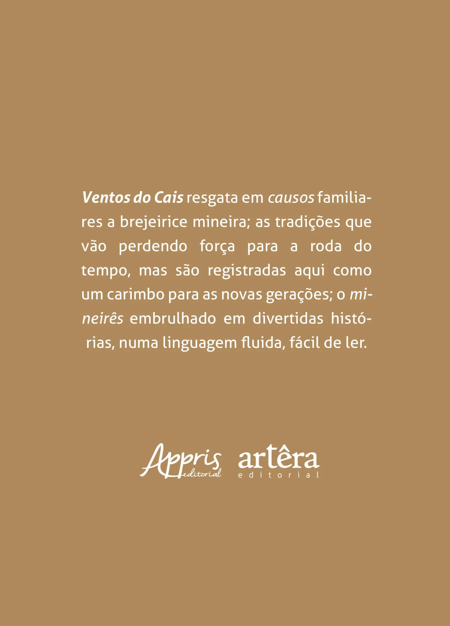 Ventos do Cais resgata em causos familiares a brejeirice mineira; as tradições que vão perdendo força para a roda do tempo, mas são registradas aqui como um carimbo para as novas gerações; o mineirês embrulhado em divertidas histórias, numa linguagem fluida, fácil de ler.
