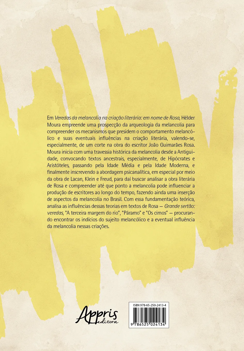 Em Veredas da melancolia na criação literária: em nome de Rosa, Hélder Moura empreende uma prospecção da arqueologia da melancolia para compreender os mecanismos que presidem o comportamento melancólico e suas eventuais in?uências na criação literária, valendo-se, especialmente, de um corte na obra do escritor João Guimarães Rosa. Moura inicia com uma travessia histórica da melancolia desde a Antiguidade, convocando textos ancestrais, especialmente, de Hipócrates e Aristóteles, passando pela Idade Média e pela Idade Moderna, e ?nalmente inscrevendo a abordagem psicanalítica, em especial por meio da obra de Lacan, Klein e Freud, para daí buscar analisar a obra literária de Rosa e compreender até que ponto a melancolia pode in?uenciar a produção de escritores ao longo do tempo, fazendo ainda uma inserção de aspectos da melancolia no Brasil. Com essa fundamentação teórica, analisa as in?uências dessas teorias em textos de Rosa — Grande sertão: veredas, “A terceira margem do rio”, “Páramo” e “Os cimos” — procurando encontrar os indícios do sujeito melancólico e a eventual in?uência da melancolia nessas criações.