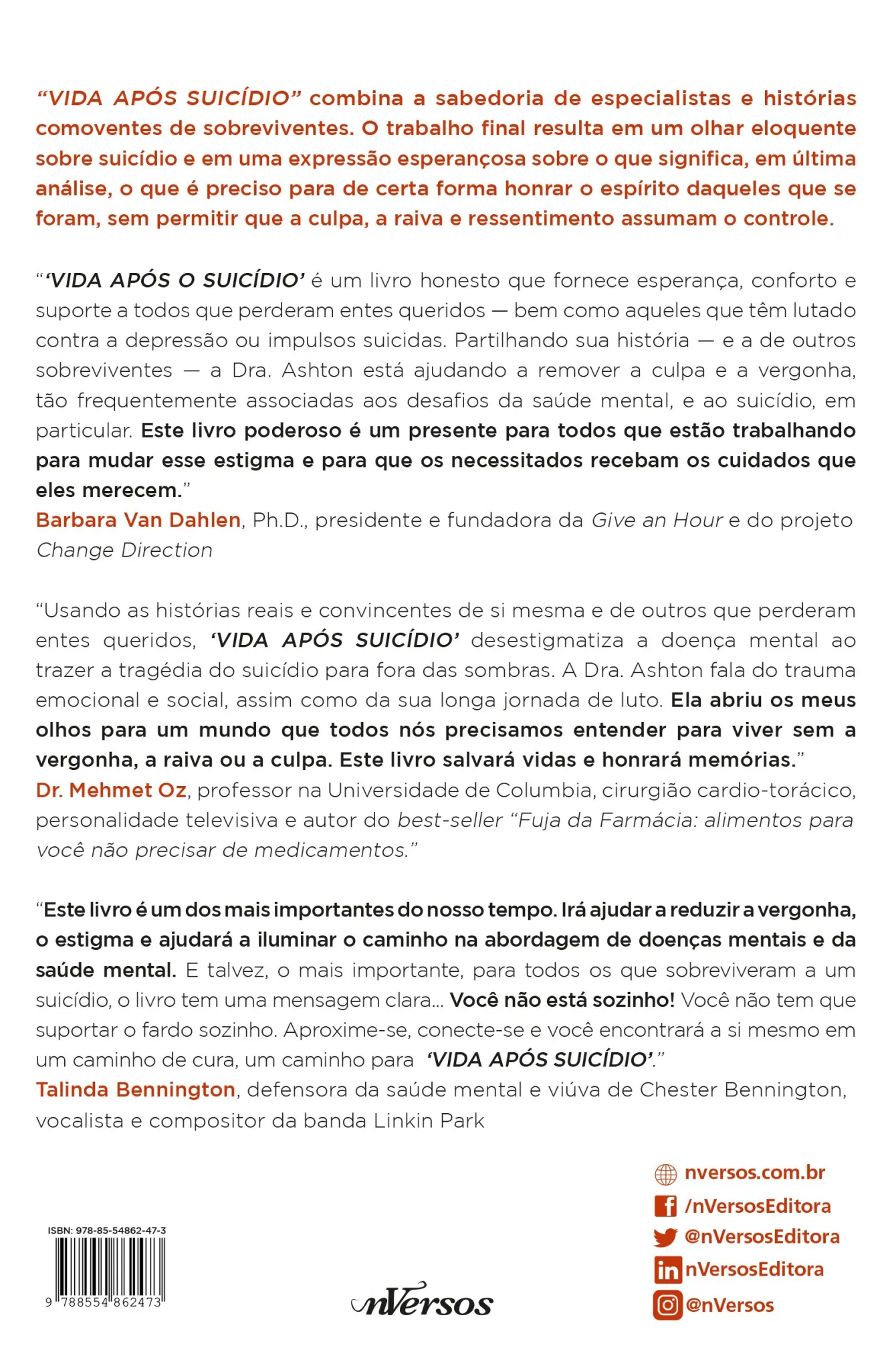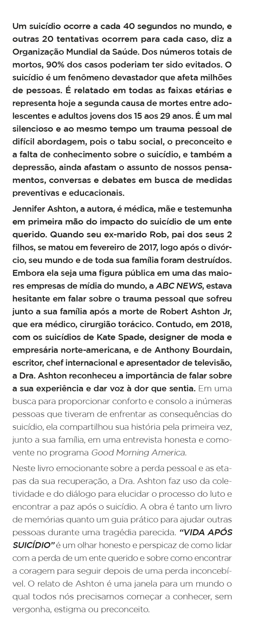 Neste livro emocionante sobre a perda pessoal e as etapas da sua recuperação, a Dra. Ashton faz uso da coletividade e do diálogo para elucidar o processo do luto e encontrar a paz após o suicídio. A obra é tanto um livro de memórias quanto um guia prático para ajudar outras pessoas durante uma tragédia parecida. “VIDA APÓS SUICÍDIO” é um olhar honesto e perspicaz de como lidar com a perda de um ente querido e sobre como encontrar a coragem para seguir depois de uma perda inconcebível. O relato de Ashton é uma janela para um mundo o qual todos nós precisamos começar a conhecer, sem vergonha, estigma ou preconceito.
