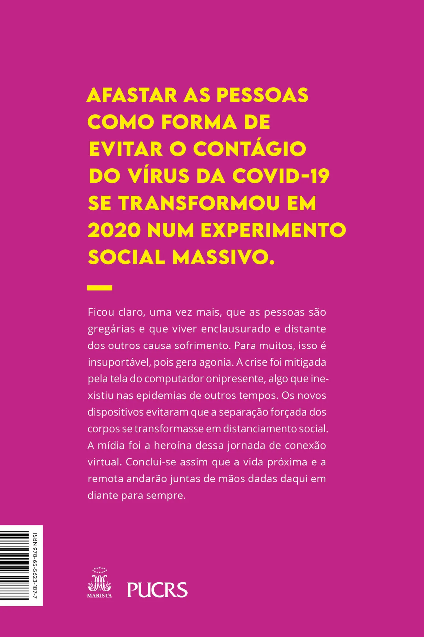 Afastar as pessoas como forma de evitar o contágio do vírus da Covid-19 se transformou em 2020 num experimento social massivo. Ficou claro, uma vez mais, que as pessoas são gregárias e que viver enclausurado e distante dos outros causa sofrimento. Para muitos, isso é insuportável, pois gera agonia. A crise foi mitigada pela tela do computador onipresente, algo que inexistiu nas epidemias de outros tempos. Os novos dispositivos evitaram que a separação forçada dos corpos se transformasse em distanciamento social. A mídia foi a heroína dessa jornada de conexão virtual. Conclui-se assim que a vida próxima e a remota andarão juntas de mãos dadas daqui em diante para sempre.